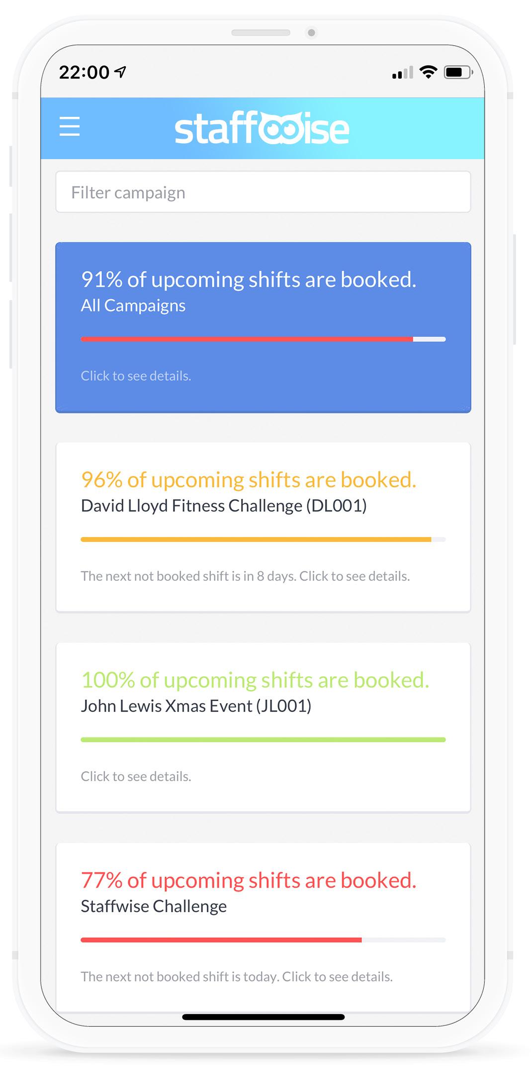 Instantly know upcoming job statuses including a percentage of shifts booked per job.