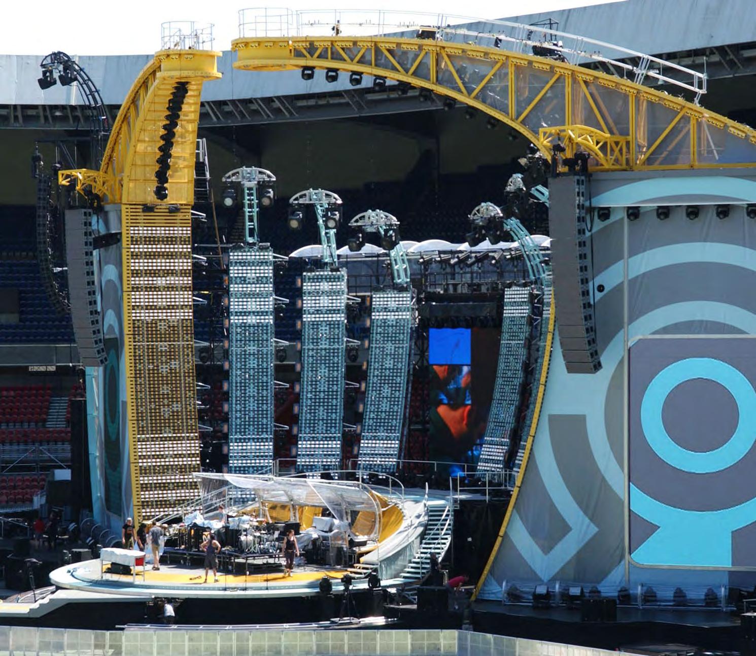 At the heart of U2’s stunning 360° show, attended by a stunning 7.3 million fans at iconic venues across the world was the giant in-the-round stage, built by Stageco, supporting 170 tons of video screens, audio and lighting.