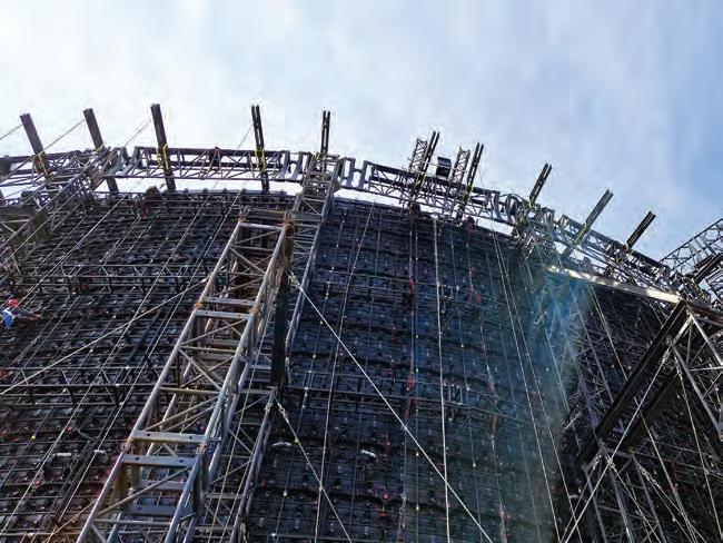 “Lifting it in sections, building the screen up from below until it reaches a height of 18m, the crew start with one panel, which is placed on our floor, then they lift it using a motor with a long cable that runs over our lifting beams.”