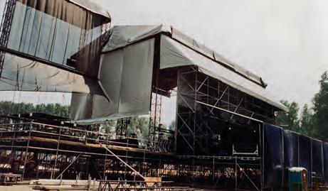 fronton, packed with clever technical gadgetry. The towers supporting the roof and the fronton were 1m towers, sprayed gold. The roof cover was composed of aluminium panels to offer increased support for the weight of the snow.