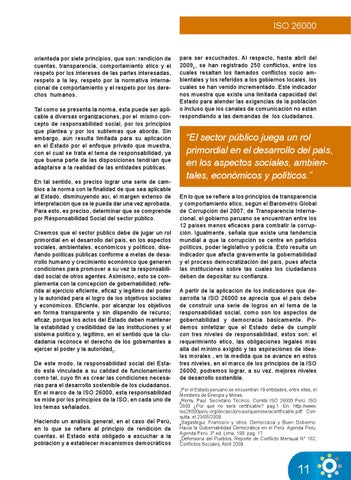 ISO 26000 orientada por siete principios, que son: rendición de cuentas, transparencia, comportamiento ético y el respeto por los intereses de las partes interesadas, respeto a la ley, respeto por la normativa internacional de comportamiento y el respeto por los derechos humanos. Tal como se presenta la norma, ésta puede ser aplicable a diversas organizaciones, por el mismo concepto de responsabilidad social, por los principios que plantea y por los subtemas que aborda. Sin embargo, aún resulta limitada para su aplicación en el Estado por el enfoque privado que muestra, con el cual se trata el tema de responsabilidad, ya que buena parte de las disposiciones tendrían que adaptarse a la realidad de las entidades públicas. En tal sentido, es preciso lograr una serie de cambios a la norma con la finalidad de que sea aplicable al Estado, disminuyendo así, el margen extenso de interpretación que se le pueda dar una vez aprobada. Para esto, es preciso, determinar que se comprende por Responsabilidad Social del sector público. Creemos que el sector público debe de jugar un rol primordial en el desarrollo del país, en los aspectos sociales, ambientales, económicos y políticos, diseñando políticas públicas conforme a metas de desarrollo humano y crecimiento económico que generen condiciones para promover a su vez la responsabilidad social de otros agentes. Asimismo, esto se complementa con la concepción de gobernabilidad, referida al ejercicio eficiente, eficaz y legítimo del poder y la autoridad para el logro de los objetivos sociales y económicos. Eficiente, por alcanzar los objetivos en forma transparente y sin dispendio de recurso; eficaz, porque los actos del Estado deben mantener la estabilidad y credibilidad de las instituciones y el sistema político y, legítimo, en el sentido que la ciudadanía reconoce el derecho de los gobernantes a ejercer el poder y la autoridad3. De este modo, la responsabilidad social del Estado está vinculada a su calidad de funcionamiento como tal, cuyo fin es crear las condiciones necesarias para el desarrollo sostenible de los ciudadanos. En el marco de la ISO 26000, esta responsabilidad se mide por los principios de la ISO, en cada uno de los temas señalados. Haciendo un análisis general, en el caso del Perú, en lo que se refiere al principio de rendición de cuentas, el Estado está obligado a escuchar a la población y a establecer mecanismos democráticos