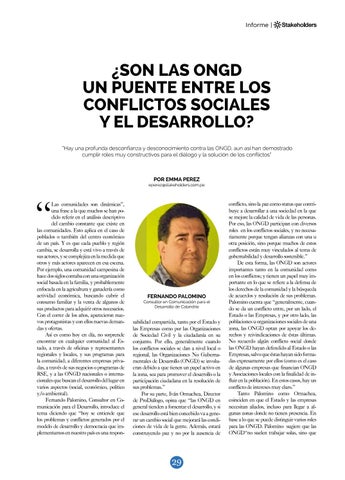 sabilidad compartida, tanto por el Estado y las Empresas como por las Organizaciones de Sociedad Civil y la ciudadanía en su conjunto. Por ello, generalmente cuando los conflictos sociales se dan a nivel local o regional, las Organizaciones No Gubernamentales de Desarrollo (ONGD) se involucran debido a que tienen un papel activo en la zona, sea para promover el desarrollo o la participación ciudadana en la resolución de sus problemas.” Por su parte, Iván Ormachea, Director de ProDiálogo, opina que “las ONGD en general tienden a fomentar el desarrollo, y si ese desarrollo está bien concebido va a generar un cambio social que mejorará las condiciones de vida de la gente. Además, estará construyendo paz y no por la ausencia de