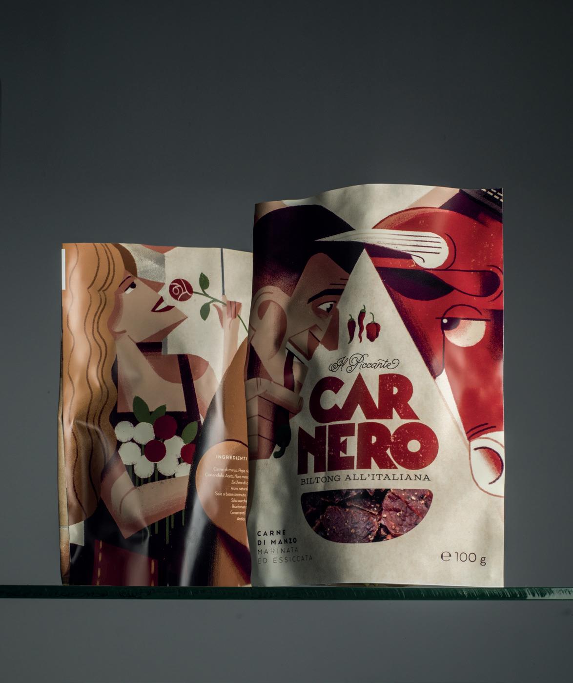 Carnero è il primo biltong italiano ed è realizzato con carne di magatello piemontese, in due referenze di prodotto: originale e piccante. Il packaging mostra, sul fronte, due figure che si fronteggiano: Mr. Carnero e la mucca. Due personaggi fortemente caratterizzati, di cui si è voluto creare e raccontare la storia. Per farlo, The 6th ha utilizzato il retro dei singoli packaging: 25 retri tutti differenti, come i pezzi di un puzzle, da affiancare per comporre l’immagine di una slice of life ricca e ironica in cui personaggi e animali interagiscono componendo una scena che sembra un quadro.