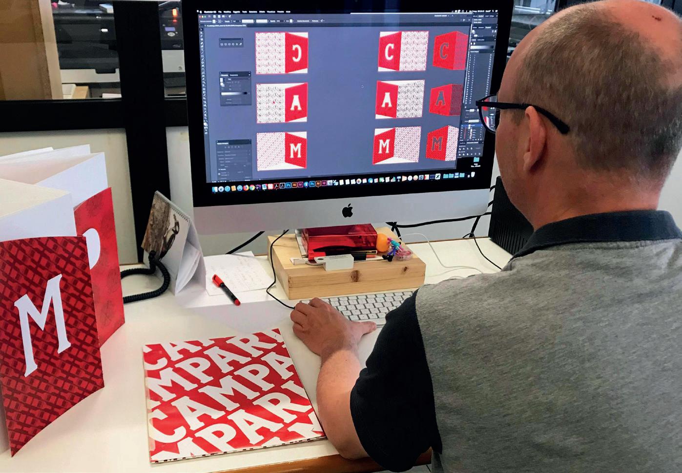 Eidos ha ben interpretato il progetto di Artefice Group per Campari, realizzando i diversi materiali che compongono l’installazione site specific che esplora il linguaggio visivo del brand. I pannelli sono stampati su materiali diversi per mostrare la versatilità del design; il tappeto, di 2.20 mm di spessore, è stampato su PVC bianco coatizzato in acrilico, i due espositori delle magnum di Campari fungono sia da sostegno per le bottiglie, sia da contenitore per i sottobicchieri, che vengono dati ai visitatori come gadget. Il tutto è stato realizzato con tecnologia Fujifilm Acuity Select Advance e Acuity Led 1600 II, con nobilitazioni ottenute dall’applicazione di una vernice lucida che mette in risalto il logo Campari. Dopo la stampa tutti i materiali sono stati fresati e controllati per l’allestimento. Il catalogo è stato stampato da Faservice. L’ambizioso progetto di Artefice Group ha permesso di mettere in gioco gran parte delle competenze tecniche di stampa e di cartotecnica dell’azienda. Prima di tutto la scelta della carta: alte grammature adatte alla cordonatura e capaci di accompagnare il lettore attraverso un percorso tattile pagina dopo pagina. Grazie alla tecnologia digitale FujiFilm JetPress 720S si è potuto riprodurre il colore “rosso Campari”, calibrando le quadricromie foglio dopo foglio e senza incontrare problemi nella produzione della serigrafia lucida presente in ogni pagina. Dopo la fustellatura a plotter dei fogli, la brossura bodoniana con copertina cartonata e tela bianca sul dorso hanno permesso di avere un prodotto adatto alla sfogliatura delle pagine.