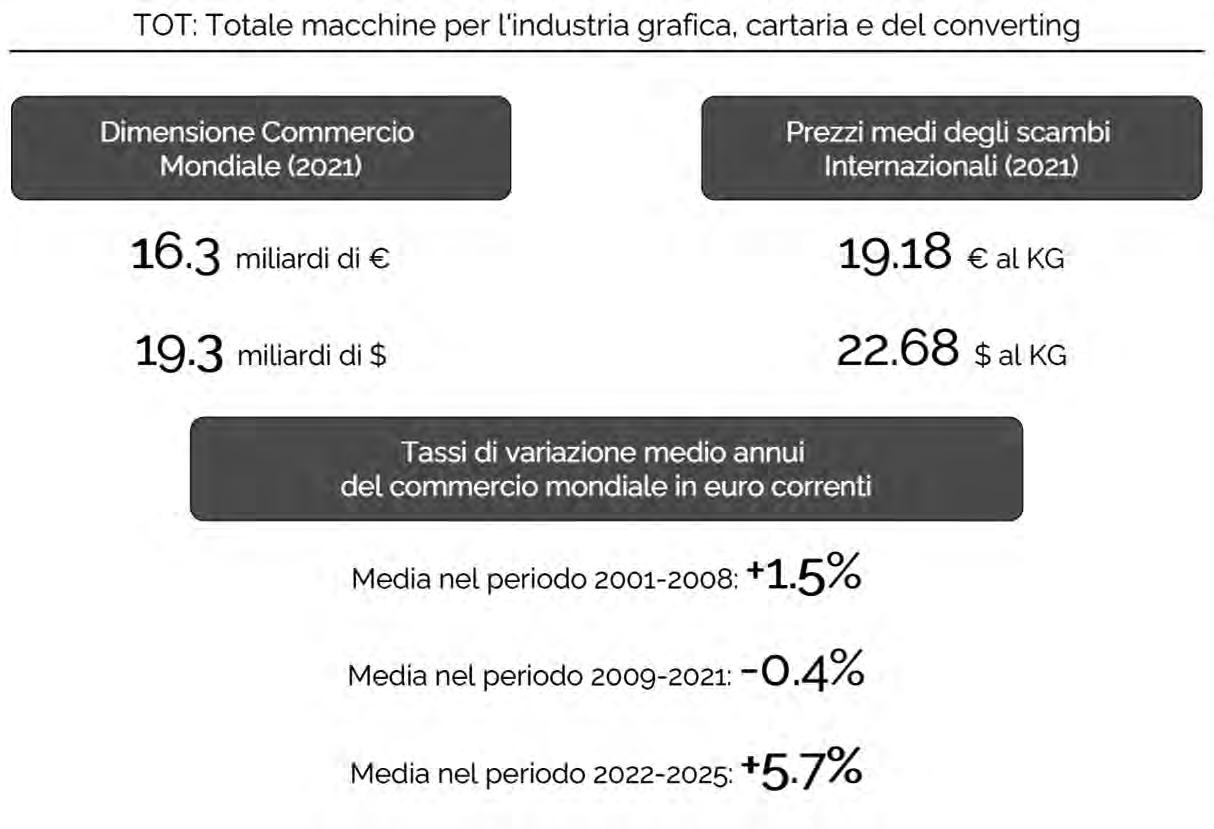 Il commercio mondiale di macchine per l'industria grafica, cartaria e del converting nel 2021 ha registrato un forte recupero (prossimo al +20% nei valori in euro), colmando il gap creatosi nell'anno pandemico (16,6% nel 2020 da fonte ExportPlanning). La crescita continua nell’anno in corso; l’impatto del conflitto russo-ucraino
