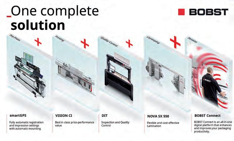 mounting, printing, digital inspection and quality control, lamination. From pre-press through to the end-product printing and laminated reels, all managed by Bobst Connect, the user-centric continuously evolving digital platform that brings all the elements of packaging production together to become “One Complete Solution.” n