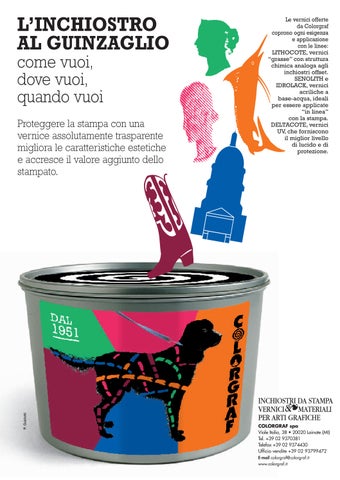 INCHIOSTRI DA STAMPA VERNICI MATERIALI PER ARTI GRAFICHE COLORGRAF spa Viale Italia, 38 • 20020 Lainate (MI) Tel. +39 02 9370381 Telefax +39 02 9374430 Ufficio vendite +39 02 93799472 E-mail colorgraf@colorgraf.it www.colorgraf.it