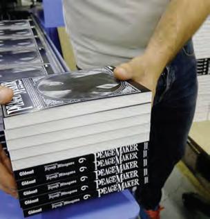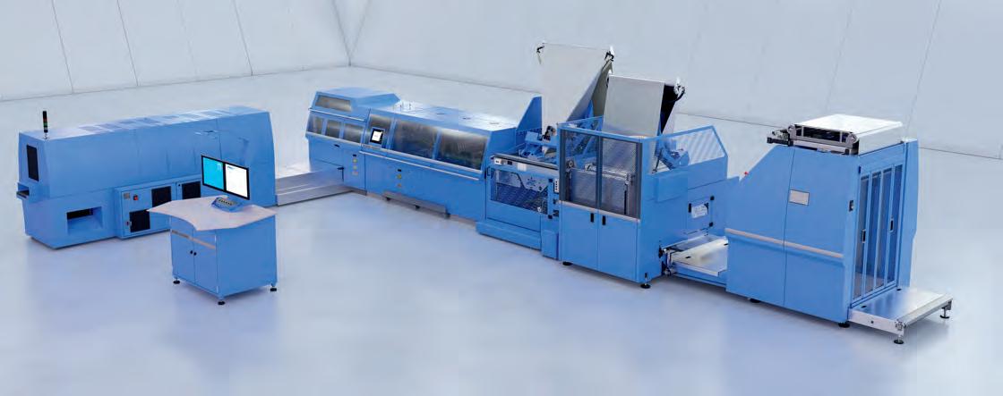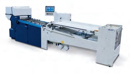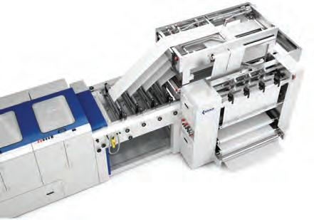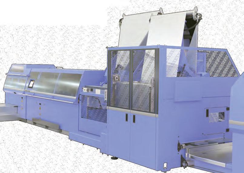 unità è corredata di lettore codici per il matching di copertine e blocco libro. Infine, dispone di uno stacker ver ticale per la raccolta dei libri di ampia capacità. Altre soluzioni installate sono le booklet factory, indicate per la produzione on demand di libretti, opuscoli, riviste e cataloghi rilegati a punto metallico. Partendo dalla carta bianca al libretto finito in un solo passaggio senza l’intervento dell’operatore. Per quanto riguarda il trilaterale può essere configurato “Near Line” con il Book Pile Feeder, che garantisce sino a 910 mm di libri precaricati, mentre la modalità “In Line” o ”Dual Mode” possiede un doppio sistema sia di integrazione in linea con la brossura che di caricamento da Pile Feeder.