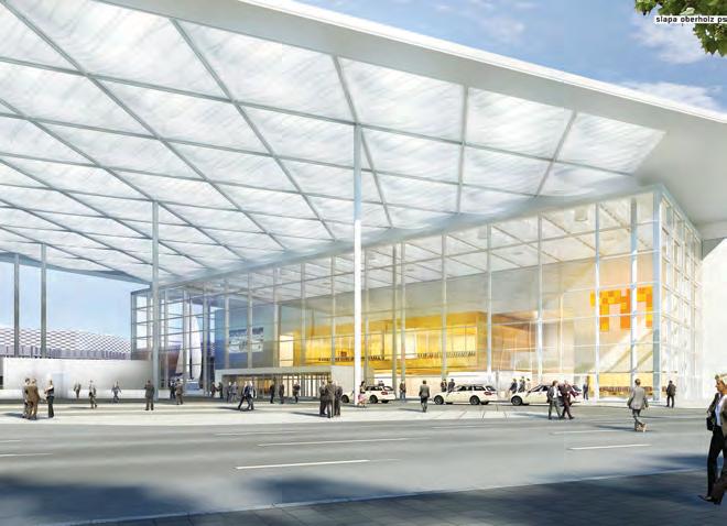 Il rendering del nuovo ingresso Sud di Drupa: un foyer di oltre 2 mila metri quadrati utilizzabile per eventi e una tettoia sporgente 20 metri