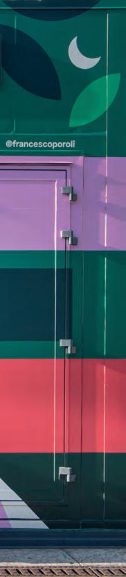 with printing, I’d never have discovered a technology that opened up a world of possible solutions for me”. As is often the case, when faced with such a wide variety of substrates and types, you have to think in strategic terms, as Poroli recalls. “Working mainly in vector graphics for digital printing, the workflow doesn’t change particularly on a technical level; it’s more a reflection on how the content will be used. Illustrating for a 3x4 cm Campari stamp or a 14 metre Eataly kiosk is different, especially in terms of its use. What level of detail can I allow myself? A stamp is a small space, but it’ll be closely observed, whereas the kiosk is a large space that has to provide interesting visual stimuli but will not be observed in detail like a work of art: it’s part of an overall experience of the space it’s in”. The solution may be to see the illustration as part of the ecosystem dialoguing with the rest and incorporate this thinking into the process. Says Guasco, “Lately, I like to work in a modular way, inserting the elements of illustration within an organic flow, which allows me to go from 6x3 metres to a postage stamp with an image that continues to