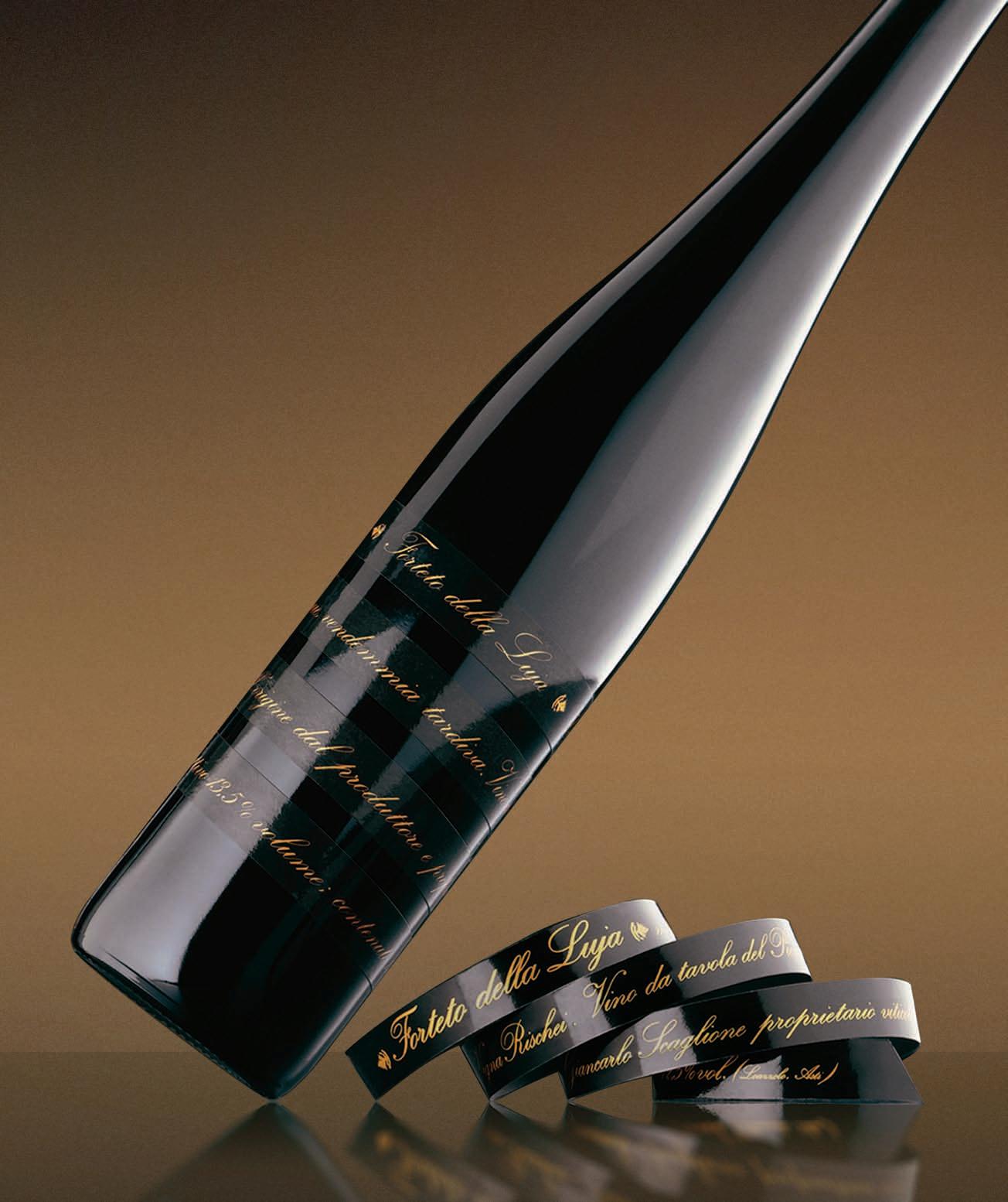 Quando D’Annunzio, a seguito di un incidente, ebbe problemi di vista, per non rinunciare alla scrittura, si fece tagliare delle striscioline di carta per poterle sentire tra le mani e poter quindi scrivere malgrado la cecità temporanea. A partire da questa memoria nasce il formato dell’etichetta per il Forteto della Luja: una lunga e sottile striscia che permette al testo di avvolgersi a spirale alla bottiglia. La scrittura in oro, riportata in un carattere corsivo, marca con meticolosità l’identità del vino. Ne testimonia la cura, l’attenzione e la tenacia che il produttore deve infondere nella coltivazione di una vigna di collina estrema e che il progetto traduce nella cura per il dettaglio: cura tecnica da un lato, riferita alla realizzazione, simbolica dall’altro, poiché capace di rimandare alla qualità dell’abbellimento, del decoro che si attribuisce al dono, all’oggetto da proteggere.
