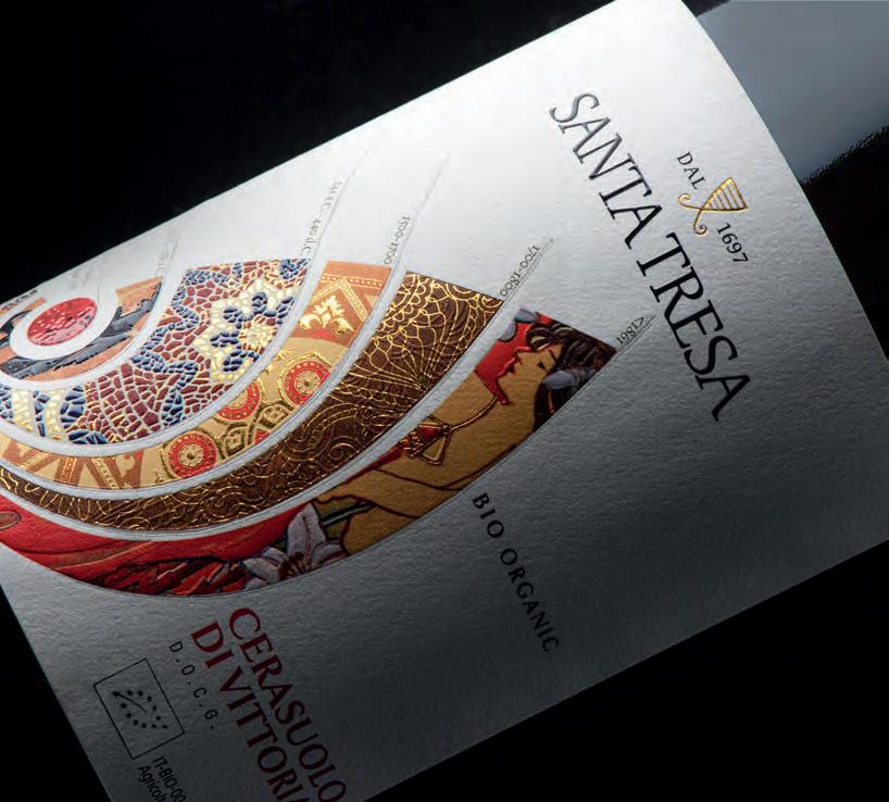 La parte inferiore è stampata a un colore nero più colore a caldo. La parte centrale è semplicemente fustellata e applicata sulla prima etichetta, mentre l’ultima etichetta è stampata in nero con vernice spessorata e numerazione progressiva. L’abilità nell’esecuzione risiede tutta nell’accoppiatura dei tre materiali.