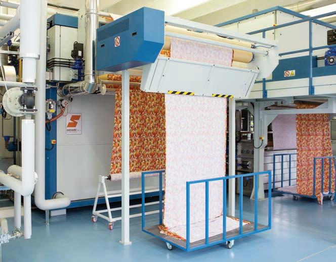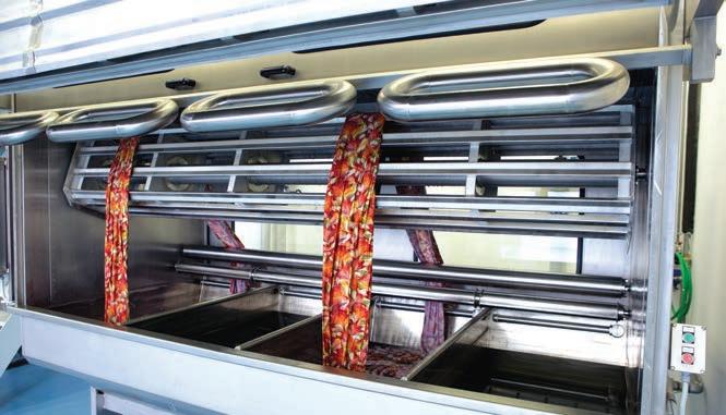 tessili, che servono a conferirgli particolari caratteristiche fisiche o visive e a renderli pronti per la commercializzazione. Questi passaggi cambiano soprattutto a seconda della chimica d’inchiostro usata. Nel caso del pigmento, infatti, basta l’asciugamento e la polimerizzazione del legante, e spesso queste due operazioni vengono svolte direttamente nella macchina da stampa o immediatamente dopo, con un processo in linea. Nel caso degli inchiostri reattivi, invece, sono necessari altri passaggi: stiamo parlando di vaporizzaggio e lavaggio. Il primo, come dice il nome stesso, consiste nel sottoporre il tessuto a un bagno controllato di vapore acqueo per aiutare i colori a “svilupparsi”, ovvero a fissarsi e ad assumere la brillantezza finale. Questa operazione è delicata e fino a poco tempo fa veniva svolta solamente fuori linea (e spesso a mano). A questo punto, però, i tessuti non sono ancora pronti per l’asciugamento in rameuse: sono ancora impregnati di addensanti, ausiliari, altri prodotti chimici. Hanno bisogno di essere lavati: passano quindi in macchine che separano in modo chimico e meccanico queste