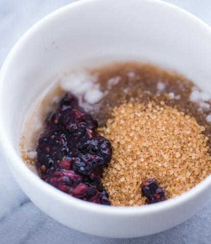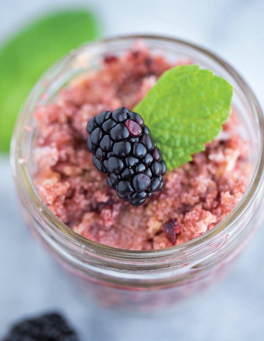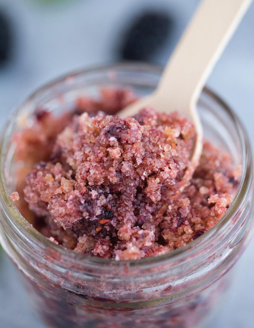 Melt coconut oil and mash blackberries with a fork. Add all ingredients to a small bowl and stir to combine. Add in extra coconut oil and/or sugar to achieve desired consistency. Scoop into a small mason jar. Store in the fridge for up to one week. To use, massage into wet feet and rinse thoroughly. Pat feet to dry.