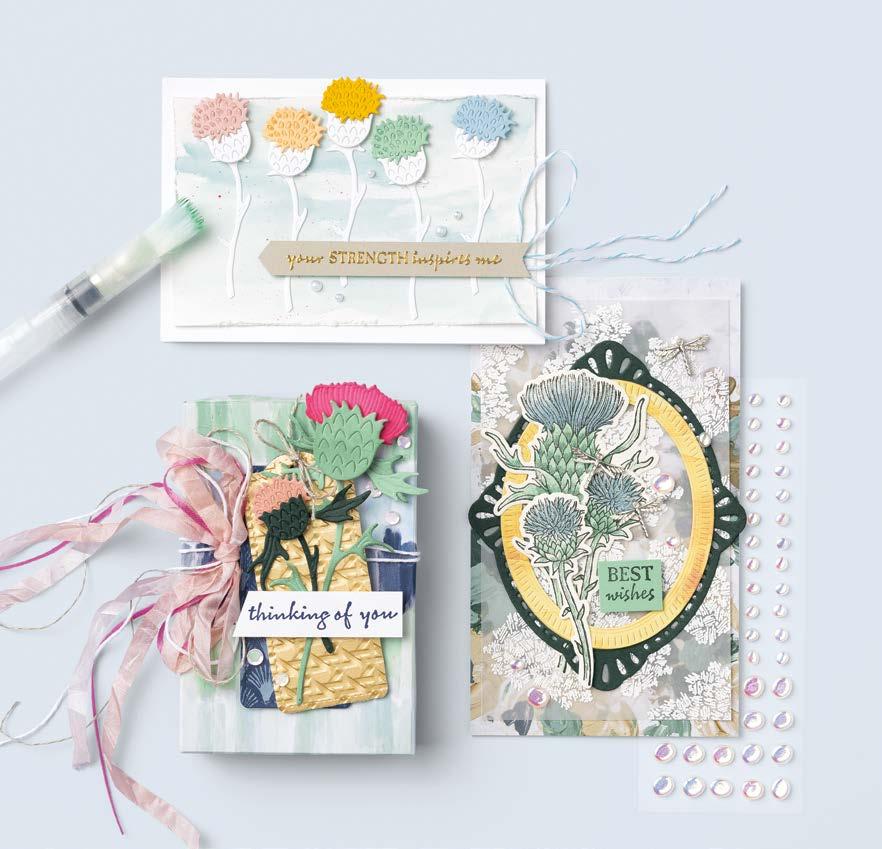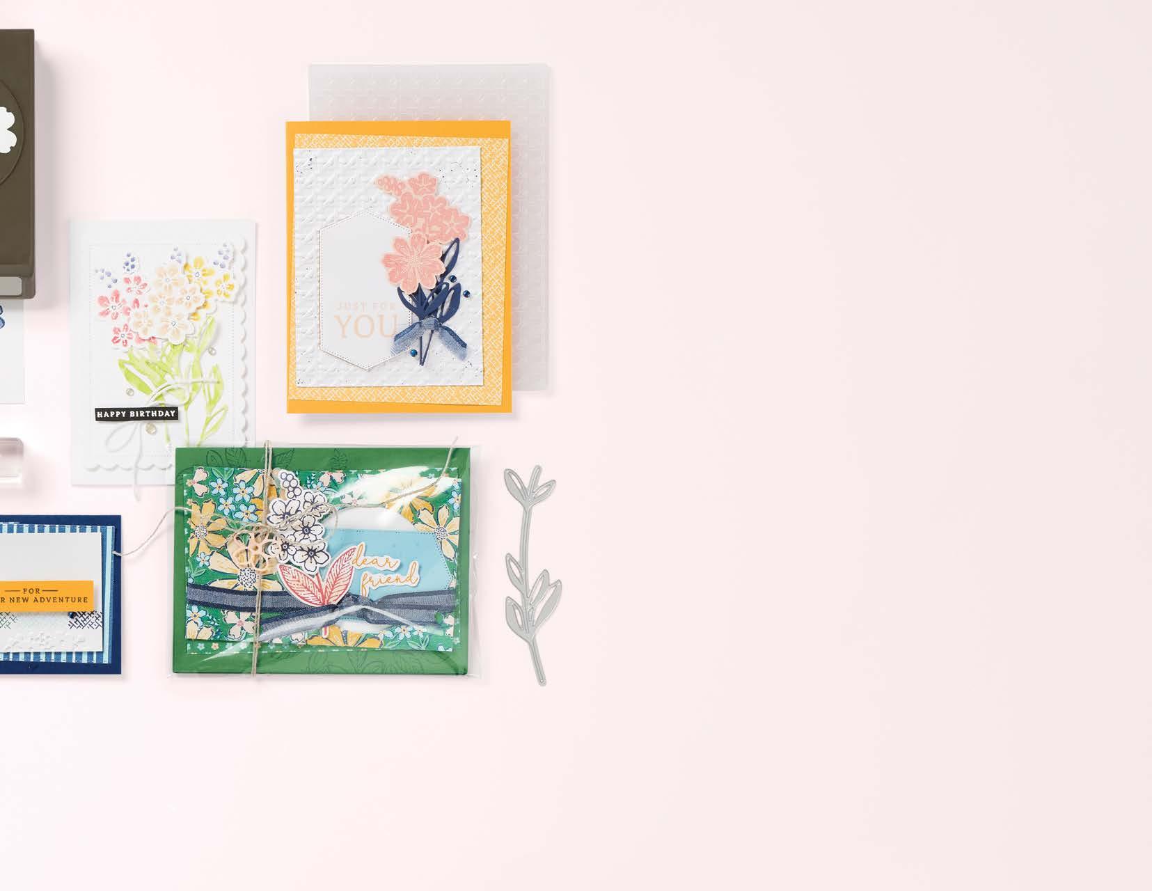 1. PRODUKTPAKET RUSTIKALER STRAUSS 160385 | 51,00 € 45,75 € | £40.00 £36.00 Klarsicht • Stempelset Rustikaler Strauß + Stanze Rustikaler Strauß (S. 81)
