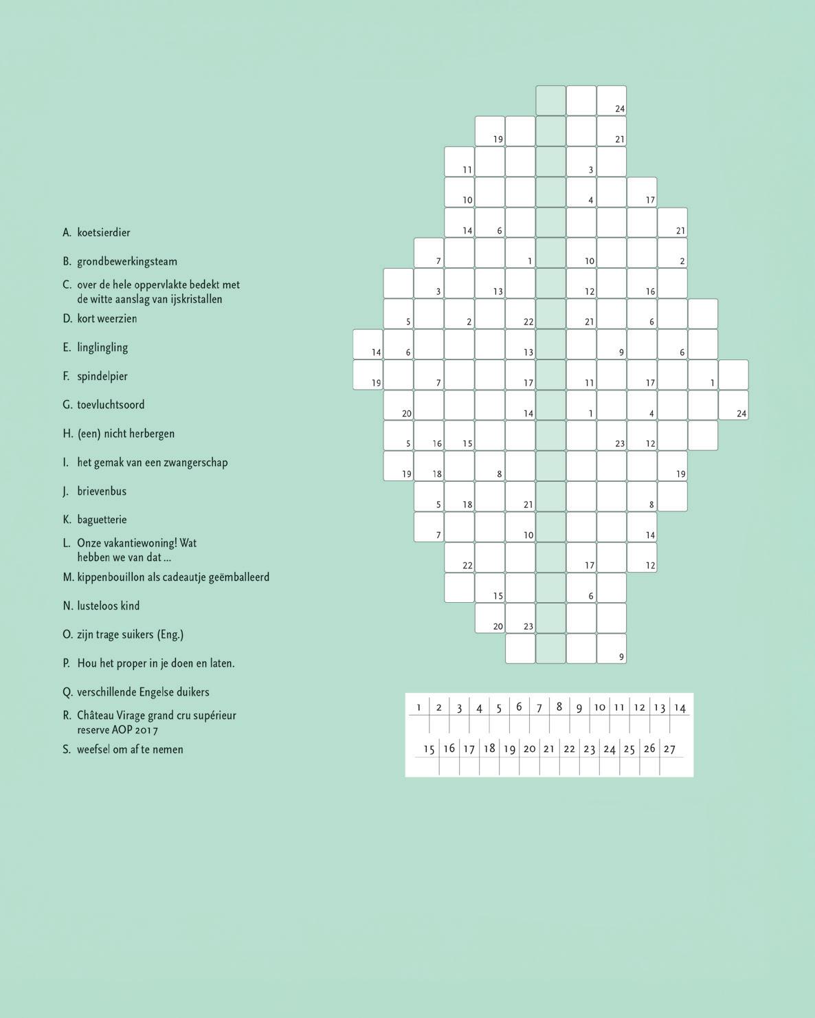 Kraak de code! Vul de woorden horizontaal in (gelijke getallen = gelijke letters). In de groene, verticale balk verschijnt een naam of begrip.