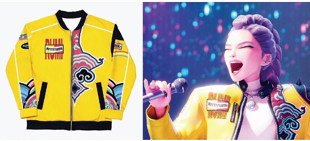 This product image shows a jacket worn by the character Rumi, right, in the animated film “KPop Demon Hunters.”