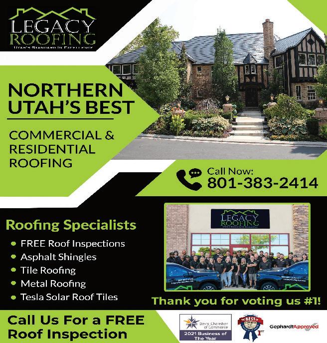 24 • BEST OF Davis County Ballot 2023 Roofing Specialists • FREE Roof Inspections • Asphalt Shingles • Tile Roofing • Metal Roofing • Utah’s Certified Tesla Solar Roof Installer Appointments@LegacyRoofingUtah.com