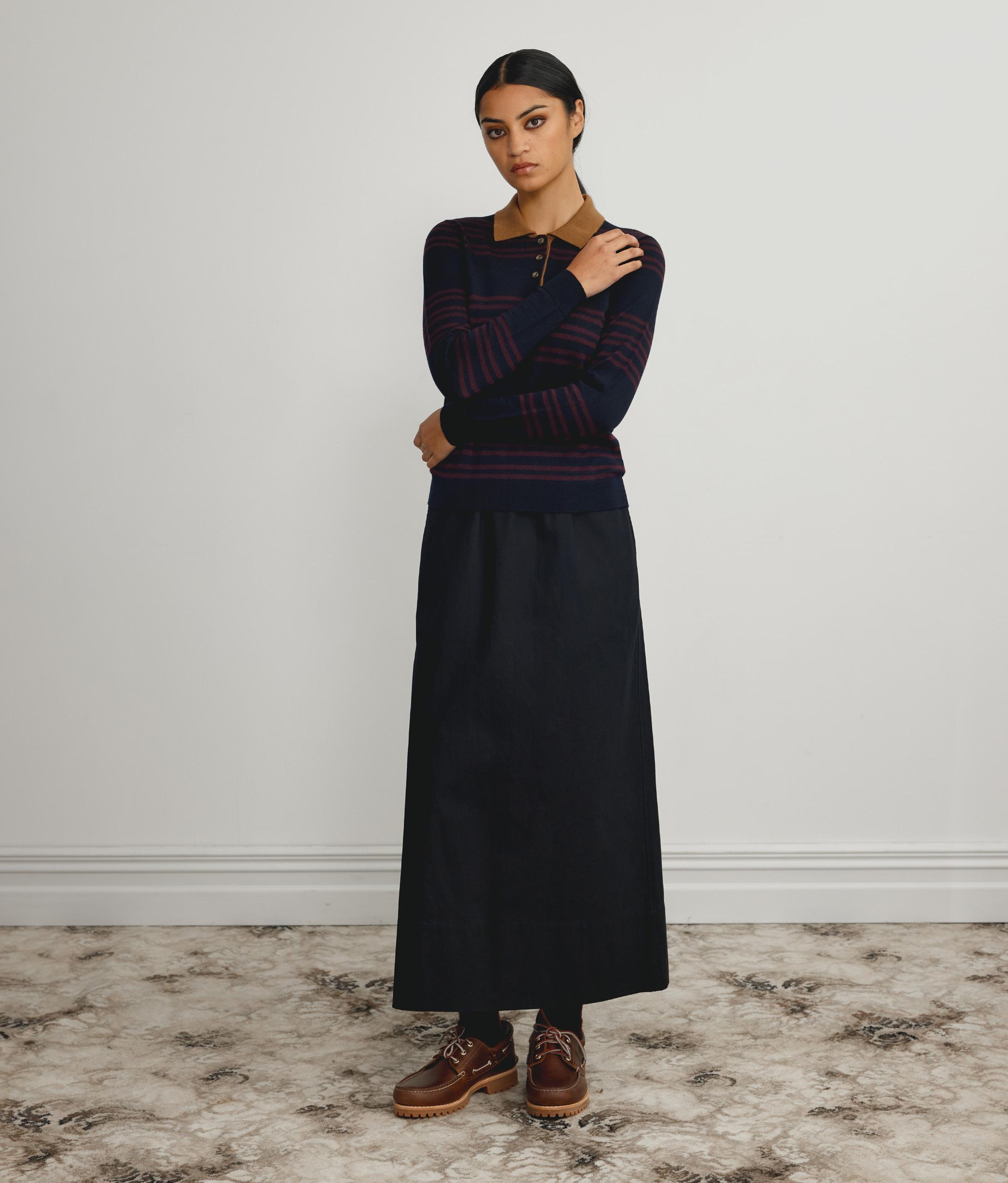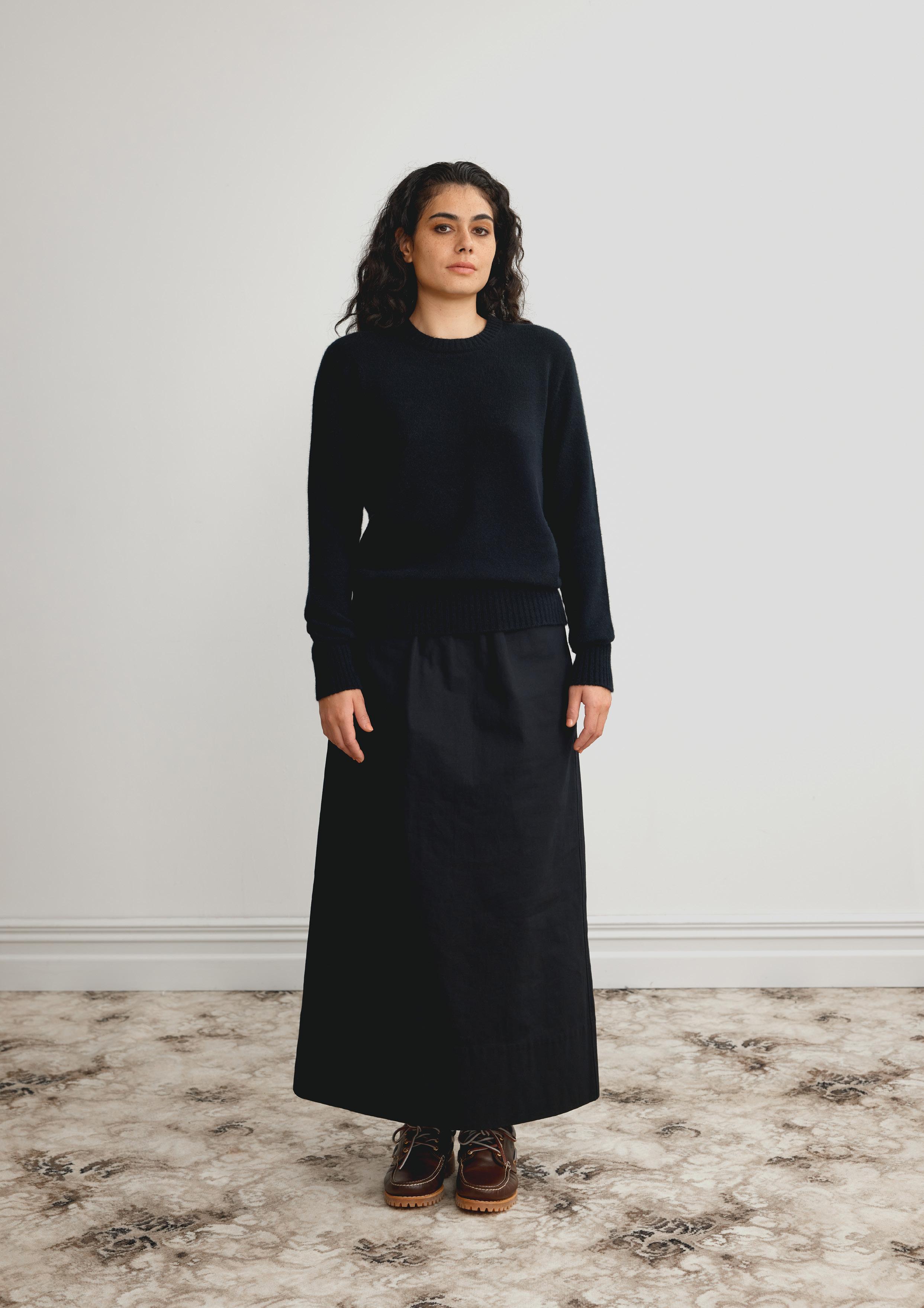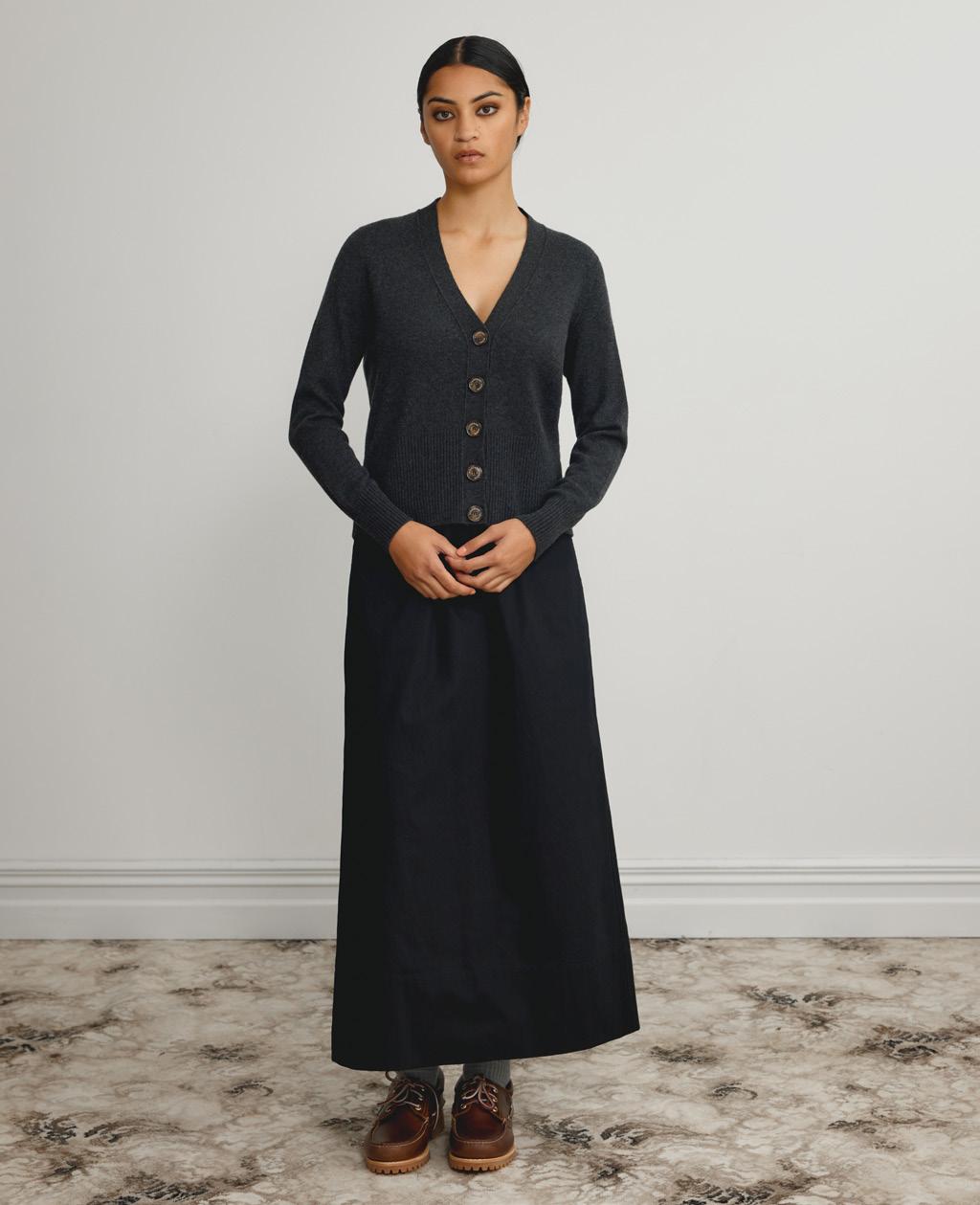 SI3232 merino tweedy crop cardigan / navy SI3216 cotton broadcloth skirt / black