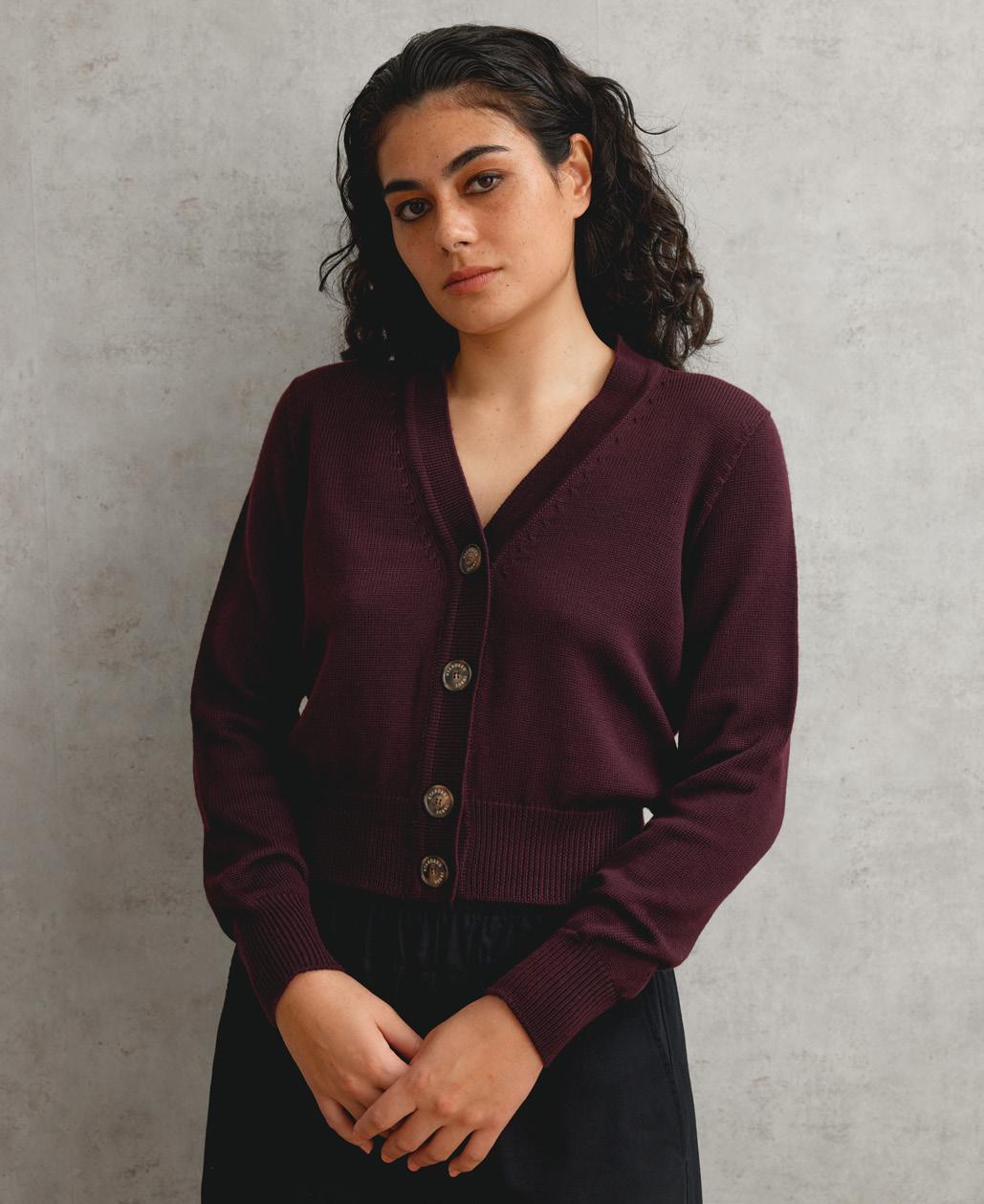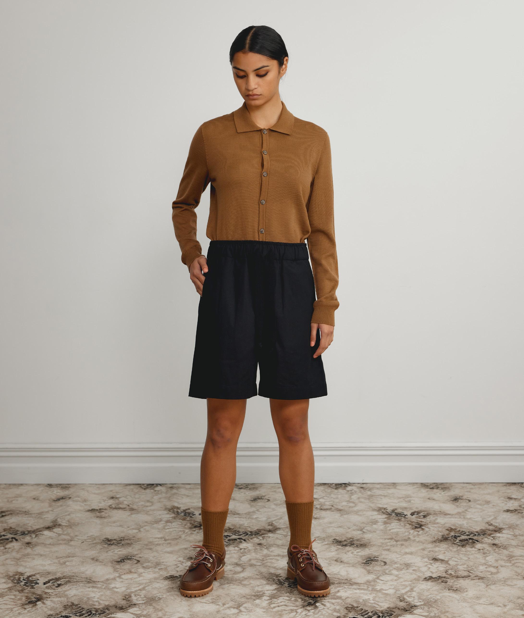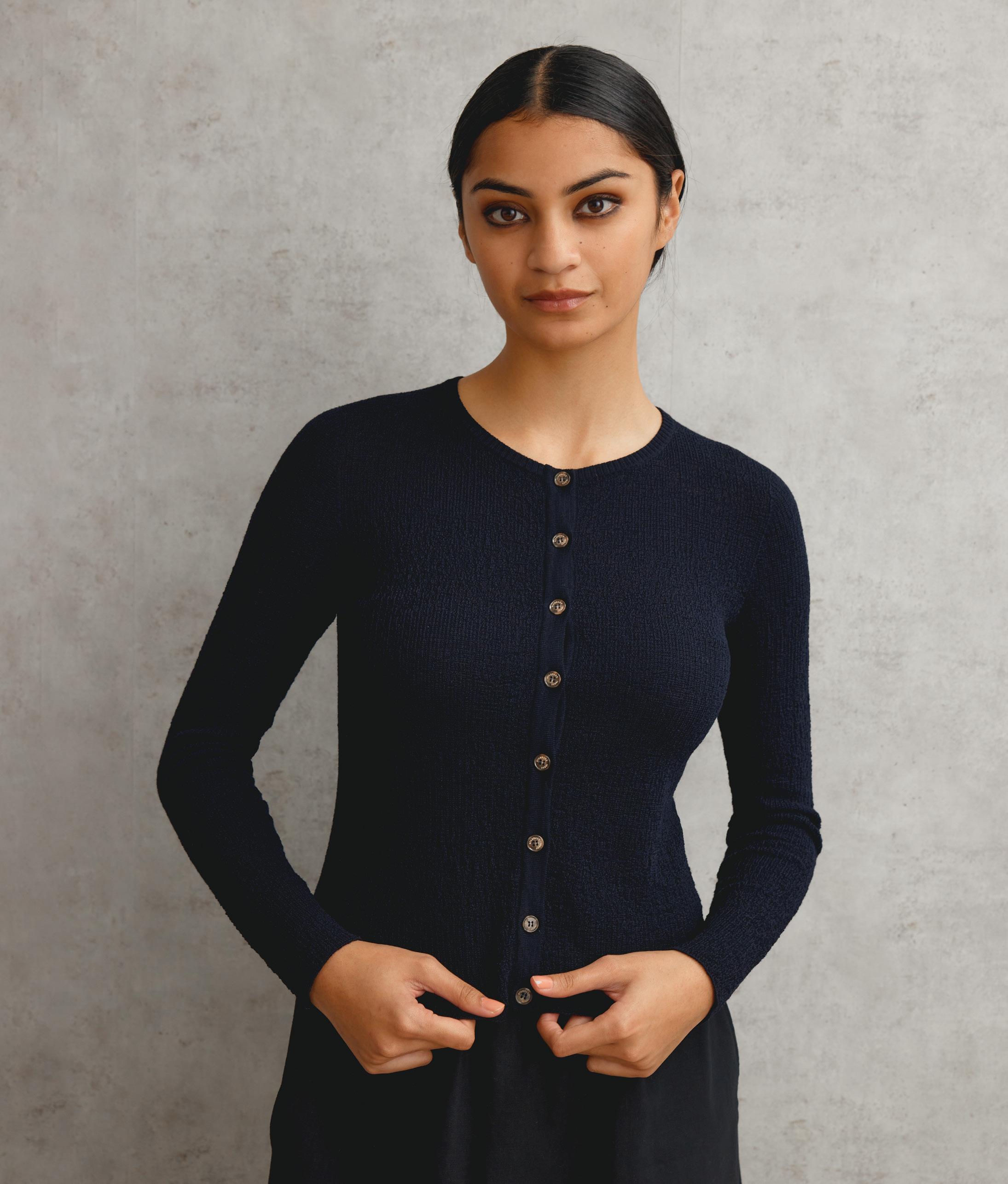 SI3232 merino tweedy crop cardigan / navy SI3216 cotton broadcloth skirt / black