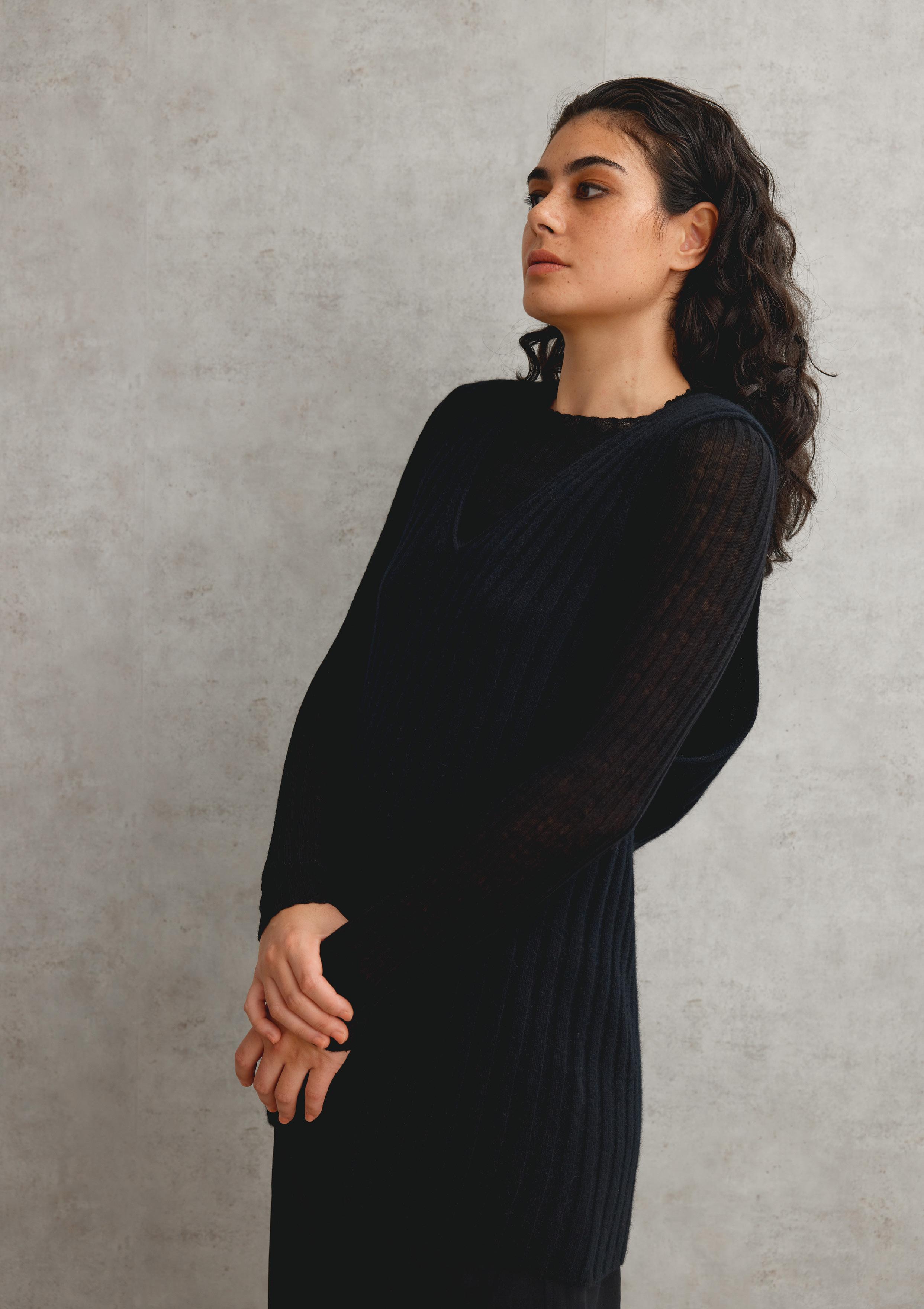 SI3234 merino v neck dress / black SI3247 merino rib sock / fig