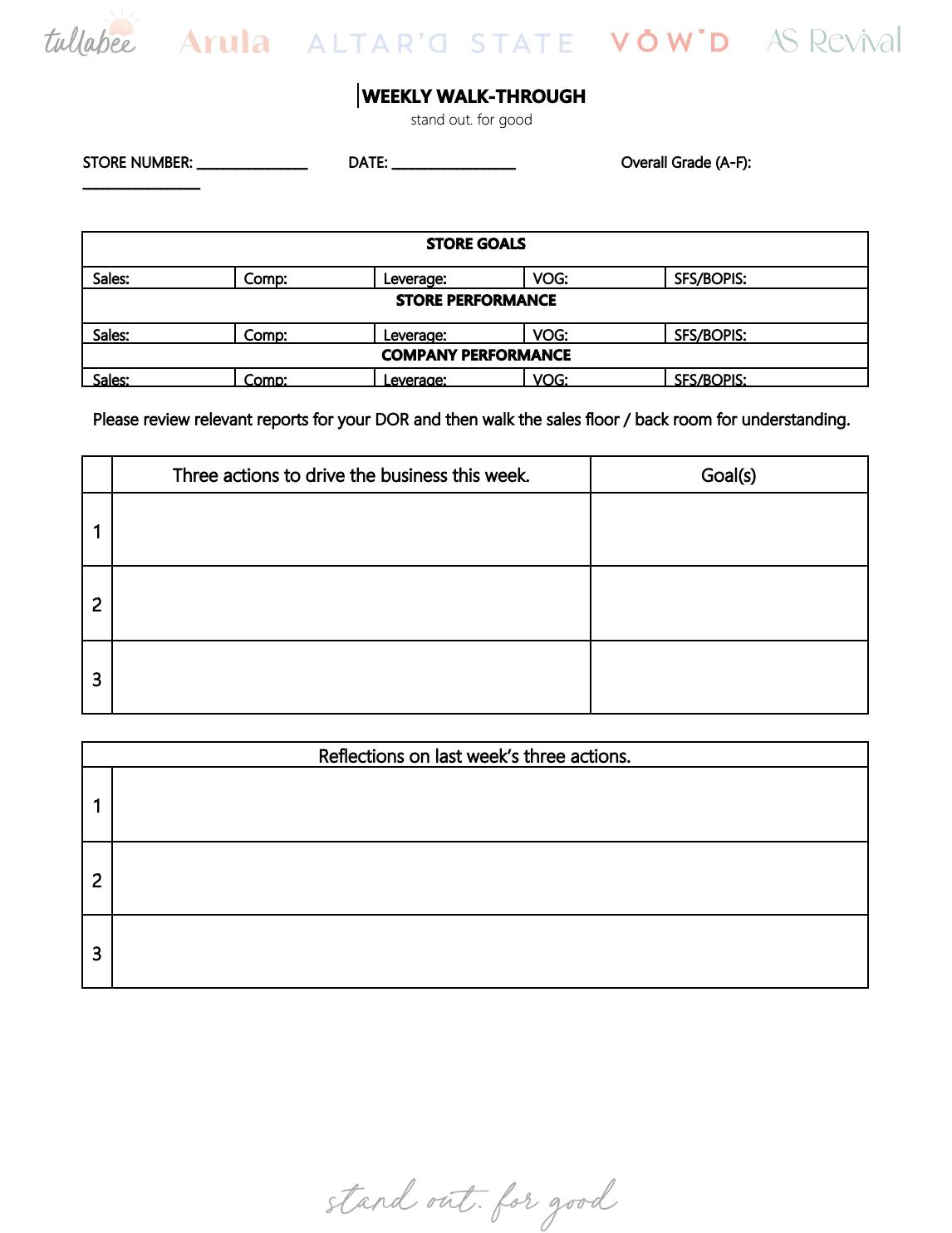 TheDORWalk-Thruformpage1shouldbefilledoutbyEACHDORpriortotheweekly LeadershipMeeting.Duringtheweeklymeeting,theformshouldbeusedtowalkthroughyourDOR speakingtothewinsanopportunitiesfromthepreviousweekaswellasaplantodrivethebusiness thisweek.