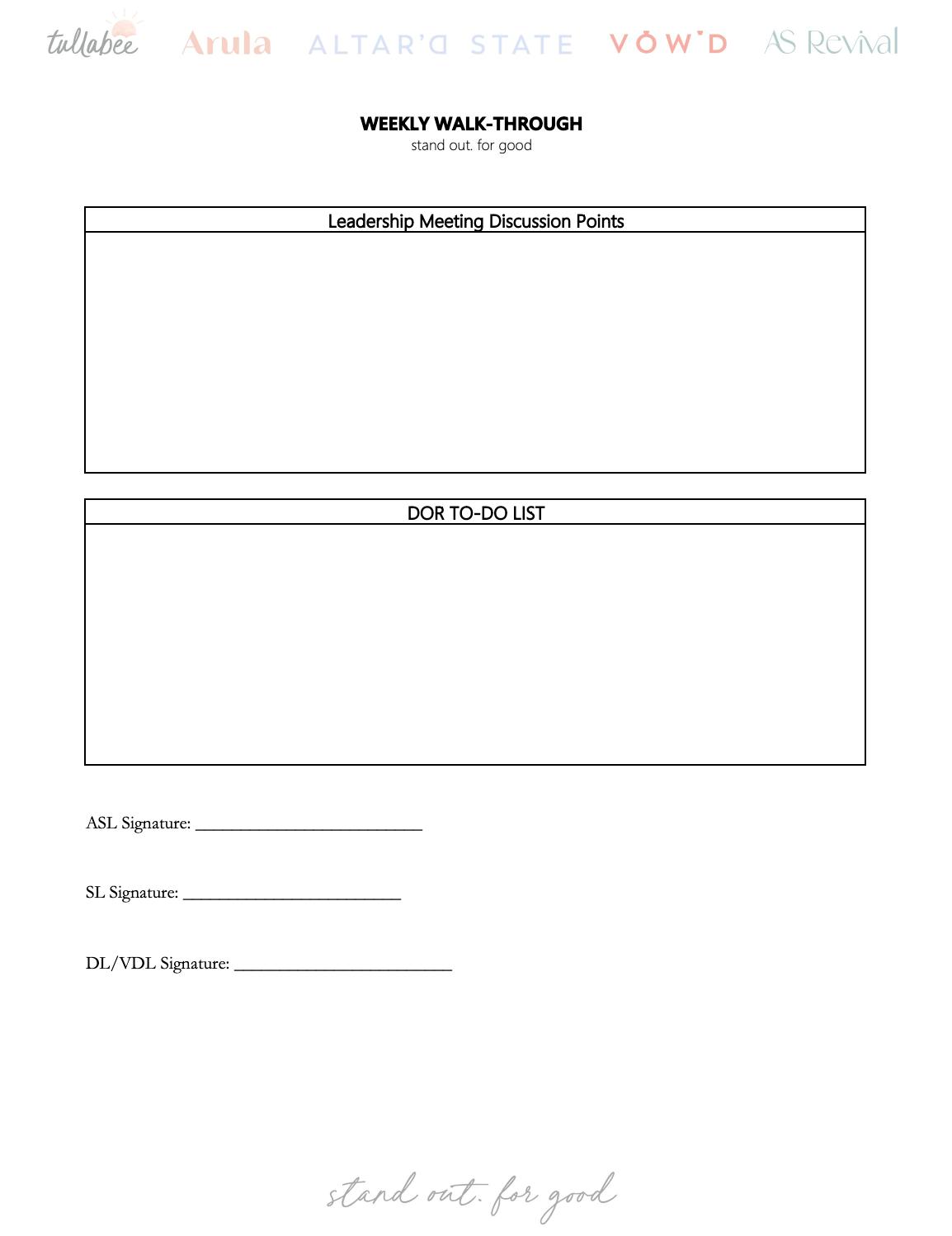 Theweeklyleadershipmeetingagendapage1shouldbefilledoutbytheSLpriortotheactual meeting.TheDORwalk-thruforms,onthefollowingpage,shouldbecompletedduringthemeeting withallleadersinattendance.Youwillthenfilloutpage2oftheLeadershipMeetingcollectivelyasa team.