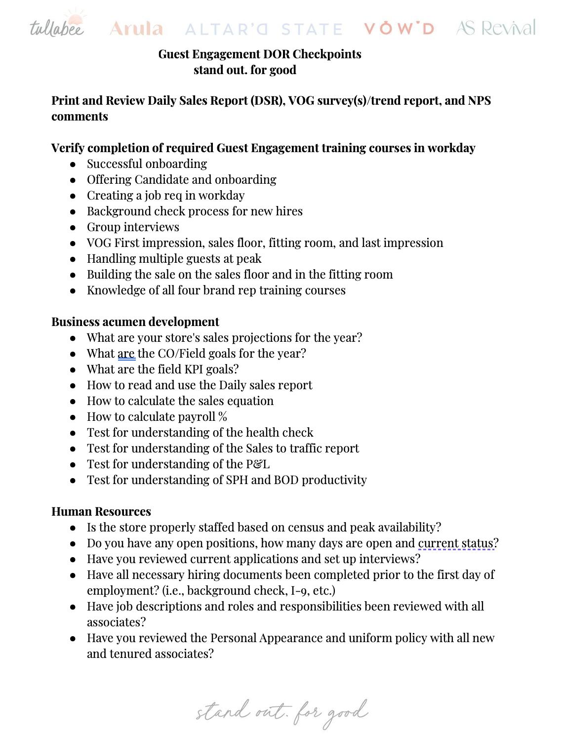 TheDORCheckpointsshouldbeusedtopreparefortheWeeklyLeadershipmeetingbyEACHDOR priortothemeeting.
