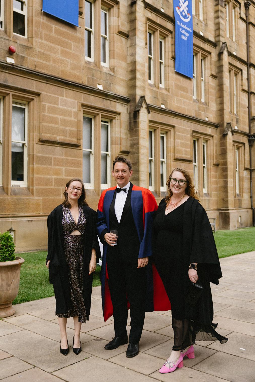 Dr Daniel Tyler speaks to third year students Kokulaan Santhakumar (Fr 2023) and Henry McGuinness (Fr 2023) before the Valedictory Dinner.