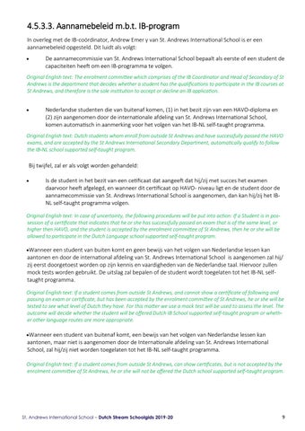aantonen, maar niet is aangenomen door de Internationale afdeling van St. Andrews International School, zal hij/zij niet worden toegelaten tot het IB-NL self-taught programma. Original English text: If a student comes from outside St Andrews, can show certificates, but is not accepted by the enrolment committee of St Andrews, he or she will not be offered the Dutch school supported self-taught program.
