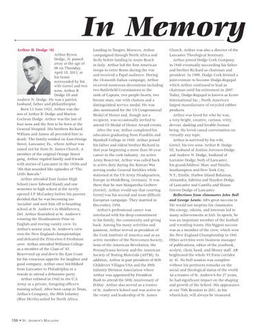 Church. Arthur was also a director of the Lancaster Theological Seminary. Arthur joined Dodge Cork Company in 1948 eventually succeeding his father and brother Richard as chairman and president. In 1989, Dodge Cork formed a joint-venture to become Dodge-Regupol which Arthur continued to lead as chairman until his retirement in 2007. Today, Dodge-Regupol is known as Ecore International Inc., North America’s largest manufacturer of recycled rubber products. Arthur was loved for who he was; a very bright, creative, curious, witty, devout, dashing and lovable human being. He loved casual conversation on virtually any topic. Arthur is survived by his wife, Gretel; his two sons: Arthur B. Dodge III, husband of Justina Juvonen-Dodge and Andrew N. Dodge, husband of Lorraine Dodge, both of Lancaster; his grandchildren: Marc and Natalie, Southampton and New York City, N.Y.; Emilie, Harbor Island Bahamas; Alexandra, Sabrina and Hayden Dodge of Lancaster and Camilla and Sloane Grover-Dodge of Lancaster. Reflections from classmates John Ball and George Lewis: AB’s great success in life would not surprise his classmates. His energy, talents, and interests led to many achievements at SAS. In sports, he was an important member of the football and wrestling teams. His biggest success was as a member of the crew, which won the New England Championship in 1941. Other activities were business manager of publications, editor of the yearbook, acolyte, choir, band, and library staff. AB brightened the whole VI Form corridor in ’41. No bull session was complete without his pertinent remarks on the social and theological status of the world. As a trustee of St. Andrew’s for 27 years, he had significant impact on the shaping and growth of the School. His appearance at our 70th Reunion in 2011, in his wheelchair, will always be treasured.
