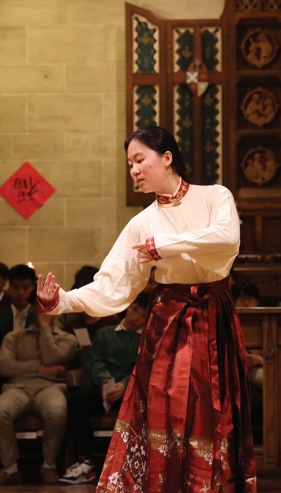 At this year’s student-led Lunar New Year Chapel service in January— for which Saints were encouraged to wear red or other bright colors to celebrate the Year of the Snake—East Asian Affinity Group members offered personal reflections; performances on cello, violin, and the Guzheng (古筝), a Chinese plucked zither; a poetry reading, and traditional dance, performed by Josephine Xie ’27.