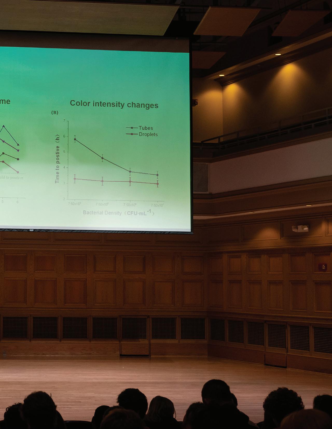 { Kevin Jin ’26 presents at the 7th Annual McLean Science Lecture Competition. The competition is an exercise in intellectual curiosity—students explore a complex topic in science that interests them and present it to the school community, TED Talk style. Jin’s talk, “Rapid Testing of Antibiotics Employing Droplet Microfluidic Chips,” won the grand prize. }
