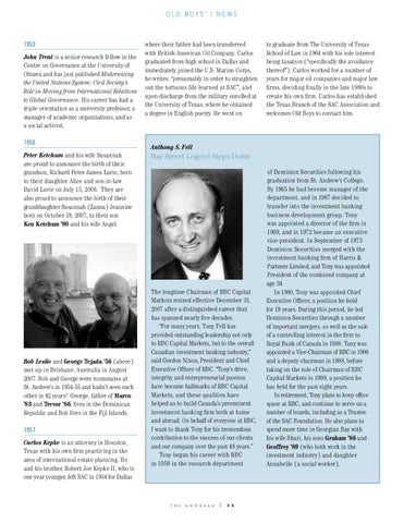 of Dominion Securities following his graduation from St. Andrew’s College. By 1965 he had become manager of the department, and in 1967 decided to transfer into the investment banking business development group. Tony was appointed a director of the firm in 1969, and in 1972 became an executive vice-president. In September of 1973 Dominion Securities merged with the investment banking firm of Harris & Partners Limited, and Tony was appointed President of the combined company at age 34. In 1980, Tony was appointed Chief Executive Officer, a position he held for 19 years. During this period, he led Dominion Securities through a number of important mergers, as well as the sale of a controlling interest in the firm to Royal Bank of Canada in 1988. Tony was appointed a Vice-Chairman of RBC in 1996 and a deputy chairman in 1998, before taking on the role of Chairman of RBC Capital Markets in 1999, a position he has held for the past eight years. In retirement, Tony plans to keep office space at RBC, and continue to serve on a number of boards, including as a Trustee of the SAC Foundation. He also plans to spend more time in Georgian Bay with his wife Shari, his sons Graham ’86 and Geoffrey ’89 (who both work in the investment industry) and daughter Annabelle (a social worker).