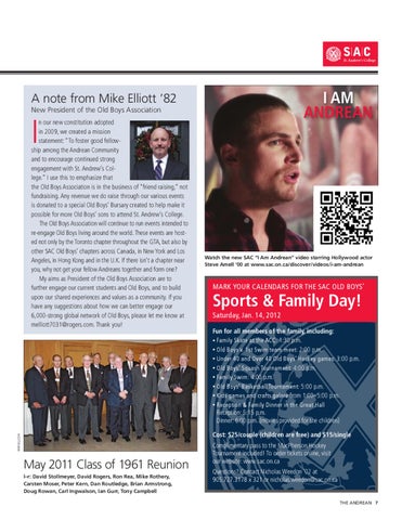 n our new constitution adopted in 2009, we created a mission statement: “To foster good fellowship among the Andrean Community and to encourage continued strong engagement with St. Andrew’s College.” I use this to emphasize that the Old Boys Association is in the business of “friend raising,” not fundraising. Any revenue we do raise through our various events is donated to a special Old Boys’ Bursary created to help make it possible for more Old Boys’ sons to attend St. Andrew’s College. The Old Boys Association will continue to run events intended to re-engage Old Boys living around the world. These events are hosted not only by the Toronto chapter throughout the GTA, but also by other SAC Old Boys’ chapters across Canada, in New York and Los Angeles, in Hong Kong and in the U.K. If there isn’t a chapter near you, why not get your fellow Andreans together and form one? My aims as President of the Old Boys Association are to further engage our current students and Old Boys, and to build upon our shared experiences and values as a community. If you have any suggestions about how we can better engage our 6,000-strong global network of Old Boys, please let me know at melliott7031@rogers.com. Thank you!