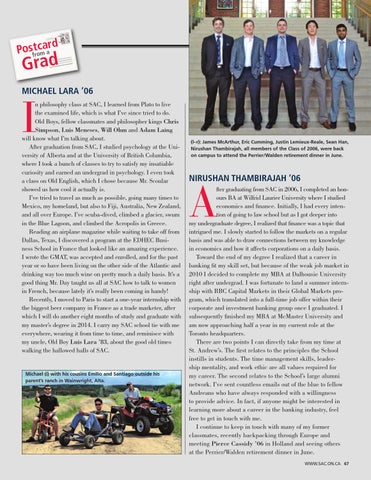 fter graduating from SAC in 2006, I completed an honours BA at Wilfrid Laurier University where I studied economics and finance. Initially, I had every intention of going to law school but as I got deeper into my undergraduate degree, I realized that finance was a topic that intrigued me. I slowly started to follow the markets on a regular basis and was able to draw connections between my knowledge in economics and how it affects corporations on a daily basis. Toward the end of my degree I realized that a career in banking fit my skill set, but because of the weak job market in 2010 I decided to complete my MBA at Dalhousie University right after undergrad. I was fortunate to land a summer internship with RBC Capital Markets in their Global Markets program, which translated into a full-time job offer within their corporate and investment banking group once I graduated. I subsequently finished my MBA at McMaster University and am now approaching half a year in my current role at the Toronto headquarters. There are two points I can directly take from my time at St. Andrew’s. The first relates to the principles the School instills in students. The time management skills, leadership mentality, and work ethic are all values required for my career. The second relates to the School’s large alumni network. I’ve sent countless emails out of the blue to fellow Andreans who have always responded with a willingness to provide advice. In fact, if anyone might be interested in learning more about a career in the banking industry, feel free to get in touch with me. I continue to keep in touch with many of my former classmates, recently backpacking through Europe and meeting Pierce Cassidy ’06 in Holland and seeing others at the Perrier/Walden retirement dinner in June. www.sac.on.ca 67
