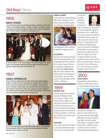 Sarah and Israel Espinoza ’97 hold their baby Julian, with godfather Pierre-Alexandre Filion ’97 on the right, and godmother Andrea Salcedo, Sarah’s sister, on the left. 44 Fall 2013