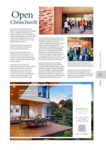 Several hundred visitors took the opportunity to visit St Andrew’s College over the weekend of Saturday 15 – Sunday 16 May, to tour the spectacular Centennial Chapel and historic Strowan House as part of Open Christchurch, a celebration of Christchurch’s most exceptional architecture. These buildings were among 40 which were open to the public for free as part of the initiative. On the Sunday, Jane Rooney, of Architectus, led two well-received Architects Tours of the Centennial Chapel, providing fascinating insights into its stunning, and national awardwinning design.