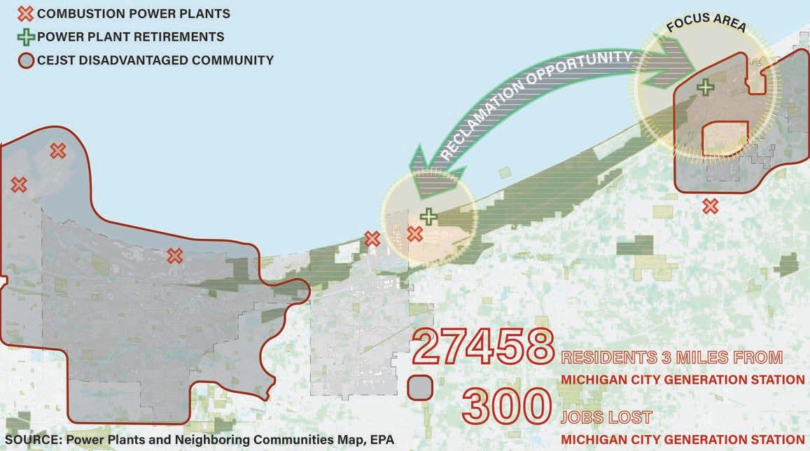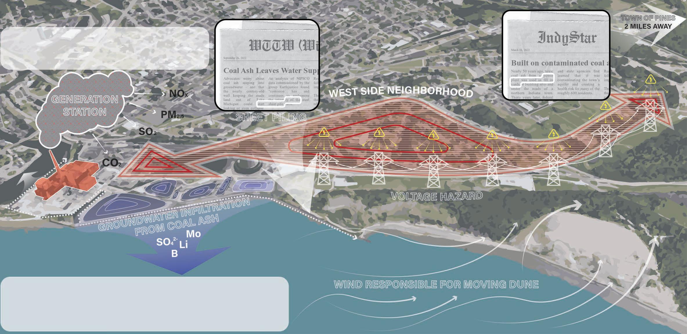 Along the corridor that is the Indiana Dunes National Park system that streams along Lake Michigan as a symbol to Northwest Indiana, the power structures of Power Plants and the culture built along the shoreline has worked to develop processes that have polluted, segregates neighborhoods that diminishes any idea of growth economically of the community members within those neighborhoods. Specifically in Michigan City, Indiana where the NIPSCO Generation Station lies, encompassing coal ash residue resulting in downstream pollution to the citizens of Michigan City that extends to Mount Baldy (a sand dune belonging to the IDNP) as well as the generation station creating harmful air pollutants having direct implications to the adjacent neighborhood, has gone into a state of disrepair and with it, the future of the shoreline becomes a hopeful entity for the people the West Side Neighborhood within Michigan City.