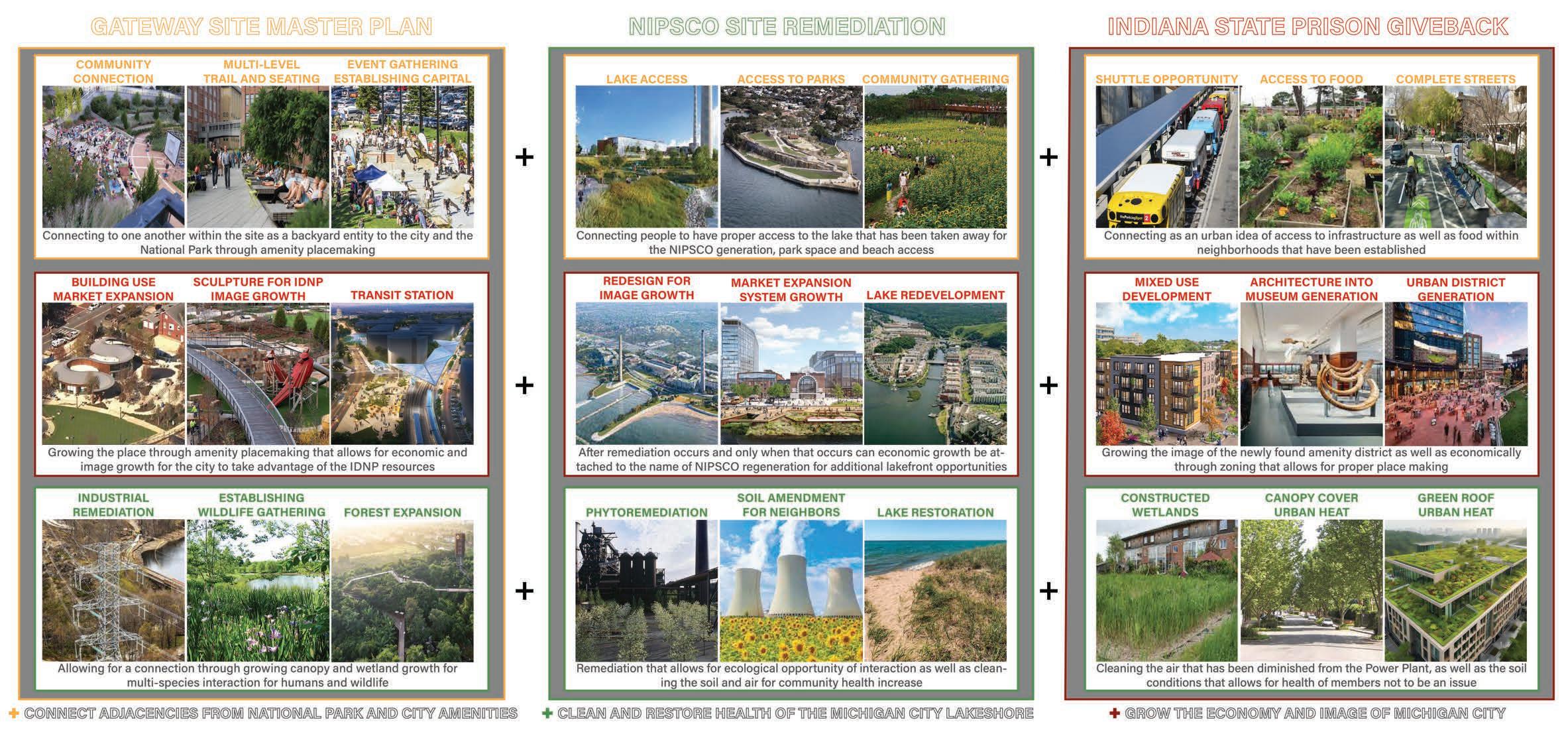 Using Vibrant Michigan City, identifying from community engagement a need for economic growth within the community of West Side, Michigan City where the Indiana State Prison site is. Ecological restoration through remediation of the NIPSCO site that is along Lake Michigan. Through that, I could discern developmental need and patterns within Michigan City as well as the National Park Boundary informing the choosing of a specific scope via the need of community resources. Looking at various developmental plans such as the TDD Implementation Strategy has done the same especially in speaking with Aaron Kowalski in guiding to look deeper into the National Park system in story telling to discern why we need an Eastern Gateway to the IDNP. Understanding the data and how it is related to the opportunities that arise from regional analysis and city analysis, can develop site goals and opportunities that are going to relate to the regional need.