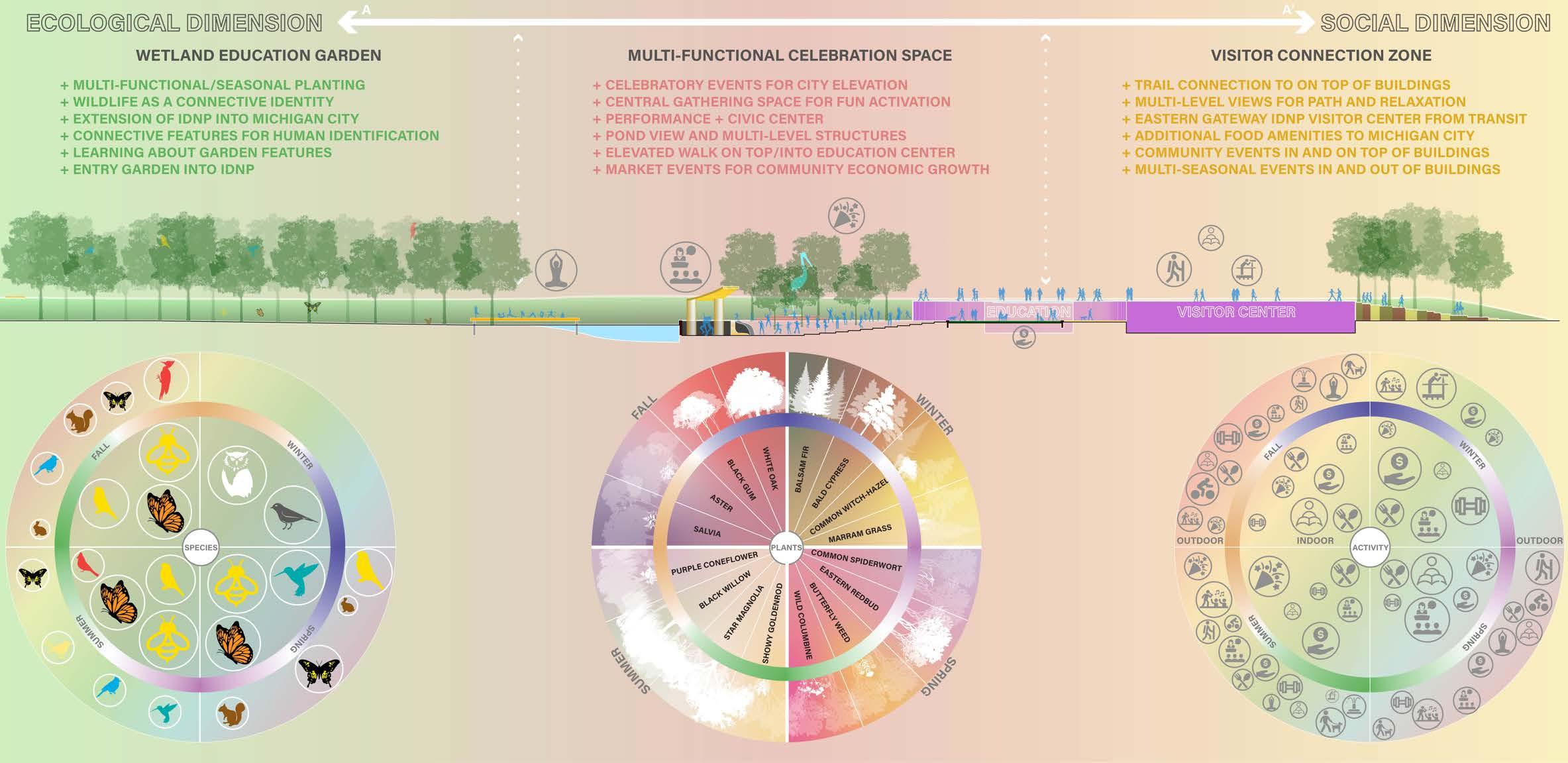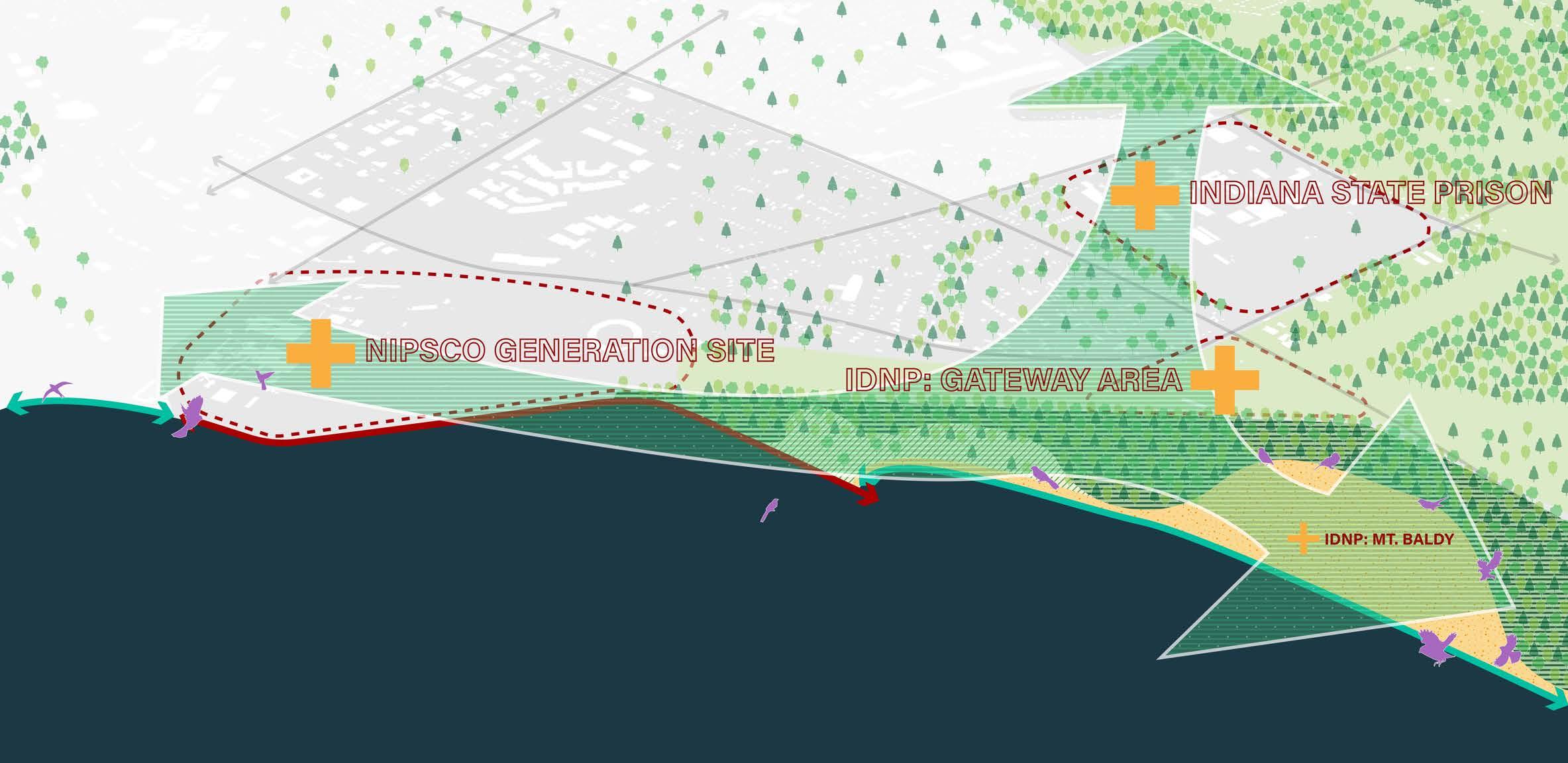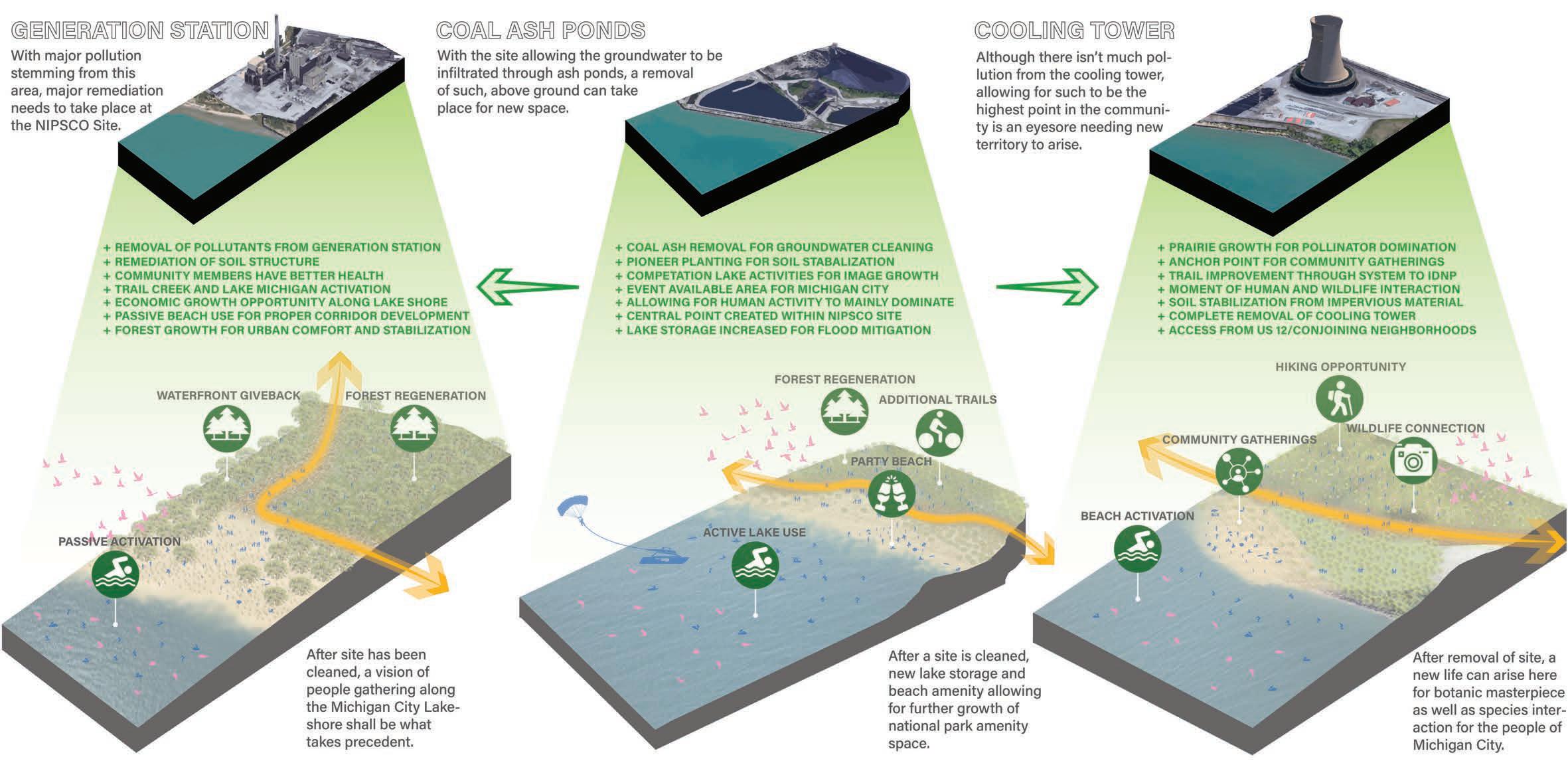 Michigan City historically has been home to the NISPCO Generation Station that has taken away the once loved Hoosier Slide and worked to own the Lakeshore. With its growth via infrastructure and harmful materials that function to diminish soil and the health of the community members, reimagining a remediated lakeshore is a purpose of design.