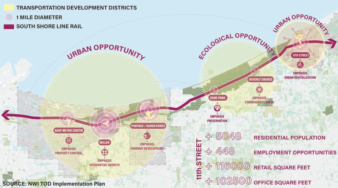 In 2021, a Northwest Indiana TOD Strategic Implementation Plan was put into place that identified areas along the South Shore Line that had economic development within cities in Northwest Indiana as a prime point. With that, discovering areas that are conjoining to IDNP features and adjacencies that are going to arise city development for pressure to be placed off of natural resources that people at IDNP worry that will be overtaken and over utilized without suspicion of development of surrounding urban centers that directly penetrate a national park. The three stations within the urban dominated opportunities happen to be close to one another in proximity to the rest of the opportunities which questions the opportunities to the national park itself as well to connecting features that connect urban centers.