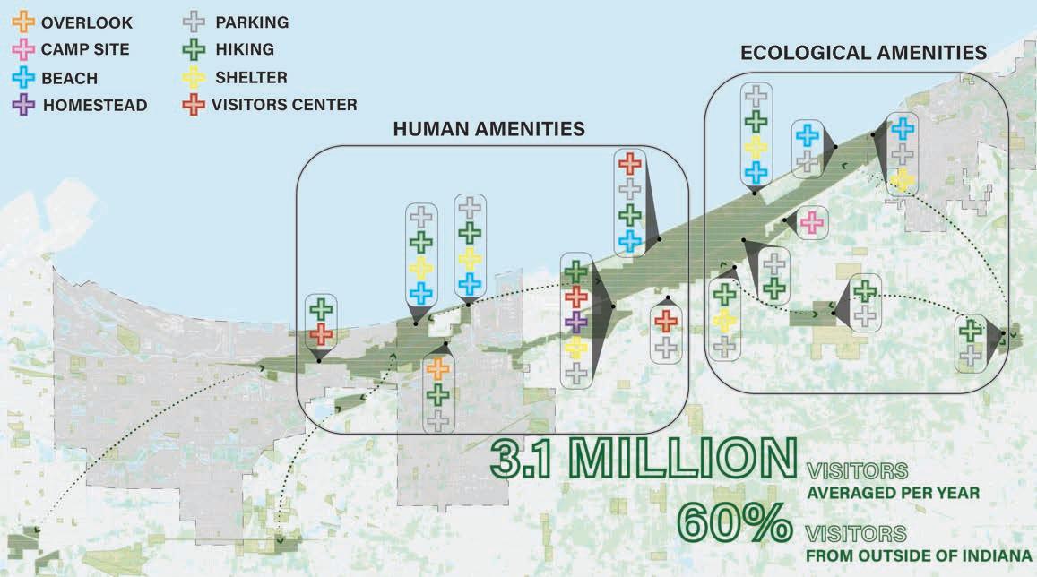 Looking at the Indiana Dunes Park Guide, as well as analyzing the park in relation to urban life around the site that the site is going to cater to during certain months of the year to then think about yearly visitors/community visitors that inhabit the site, we see that near cities like Gary and Portage, there is a more human focus activity scene then just the ecological resource viewing and trails although that opportunity arises within these spaces. Near the state park rather than the national park itself is going to have less sensitive resources for restoration from industrial adjacencies, gives opportunity to cater to the public with visitors centers, ways to interact with people via history in the landscape, although the motive is for economic development within the site itself that allows for more human use and interaction.