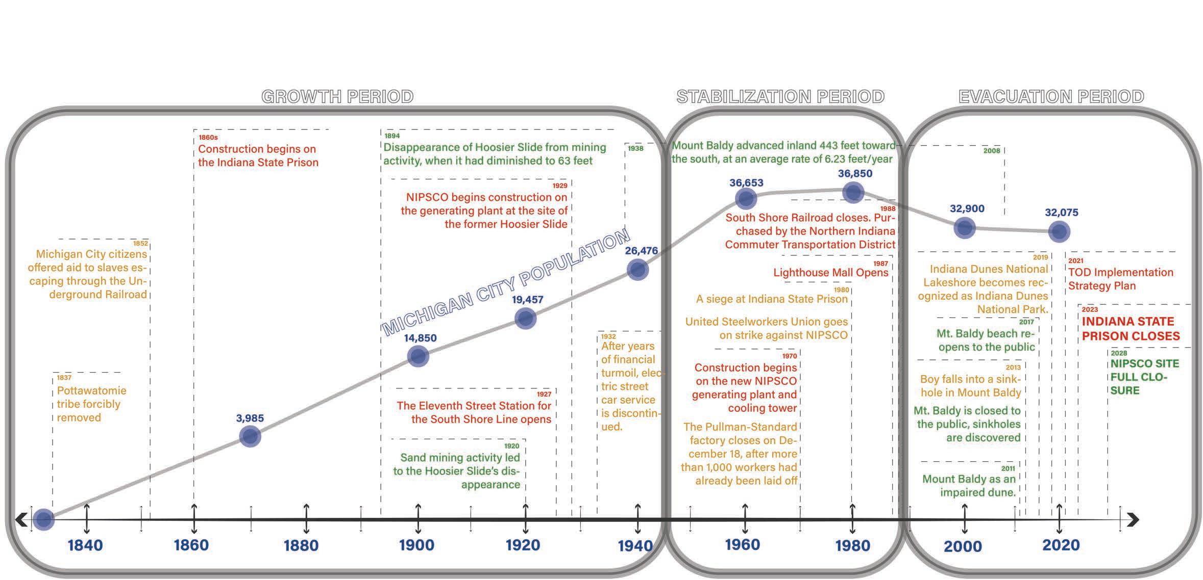 Michigan City, Indiana has developed in the eyes of industry first. With that, companies have made very strong monopolies of what is created and who has the resources within the jurisdiction to have the strong hand. Although that is the case, there is a strong community image in Michigan City that has been diminished through land use with the Hoosier Slide being once a city amenity, now a detriment to the community through the gathering of the NIPSCO Generation station that has historically led to shifting in subsequent dunes within the IDNP. With the Great Depression having national implications, Michigan City was not allergic to the oppressive qualities of the depression leading to businesses leaving and land ownership changing to fit with the times of the change leading to a more stabilized system in terms of the city population. Since stabilization, the city has experienced an exodus of residents periodically and the mission within the project is to have growth be determined by successful and sustainable qualities of development for future generations.