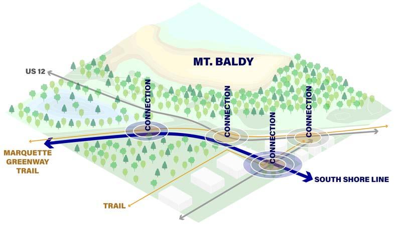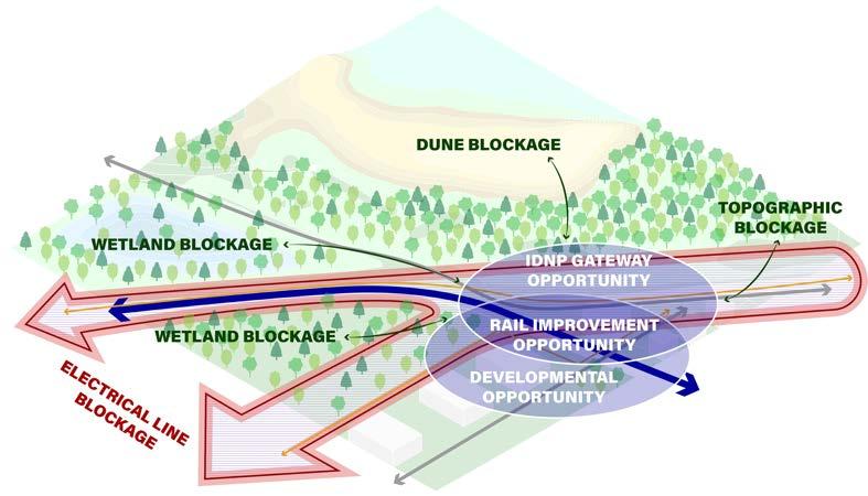 PARK: EASTERN GATEWAY IDNP GATEWAY CONCEPT GENERATION REMOVAL OF ELECTRICAL LINE BLOCKAGE SOUTH SHORE LINE ADDITIONAL STOP REALIGNING US 12 FOR LARGER GATEWAY EXPERIENCE RESTORATION OF SITE WETLANDS MICHIGAN CITY RAILROAD MUSEUM RETROFIT ROAD DIET US 12 + PENETRATING STREETS PIONEER SPECIES PLANTING NEAR MOUNT BALDY IDNP EASTERN GATEWAY VISITORS CENTER PATHWAYS DIRECTLY TO THE BEACH THROUGH FOREST URBAN + SUBURBAN + NATIONAL STYLE CANOPY PARK DEVELOPMENT + NATIONAL OPPORTUNITY WAYFINDING IMPROVEMENTS ALONG TRAILS TO IDNP INCREASED FLOOD STORAGE + STORMWATER SEQUESTRATION DIRECT TRAIN CONNECTION CONNECTION OF TRAIL SPACES TO AMENITIES WILDLIFE INTRODUCTION TO MICHIGAN CITY AMENITY ENTRANCE FOR COMMUNITY + VISITOR ATTENDANCE COMMUNITY + NATIONAL ANCHOR ESTABLISHED PARK SPACE GENERATION WITHOUT BLOCKAGE COMMUNITY AMENITY ADJACENT TO A NATIONAL AMENITY MULTI-MODAL TRANSIT OPPORTUNITIES NEAR IDNP STABILIZATION OF MOUNT BALDY MOVEMENT DIFFERENT USER GROUPS AT MULTIPLE TIMES OF THE YEAR LEARNING OPPORTUNITIES OF COMMUNITY + NATIONAL AMENITIES