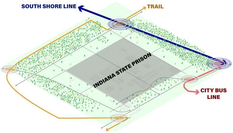 The prison site is currently isolated within the West Side Neighborhood. Without direct access to city resources and without a reason to go to this area currently is an opportunity to bring amenity to this space and allow for this area to have sustainable reach to the National Park and the city of Michigan City through the trail moving through the site in terms of corridor growth.