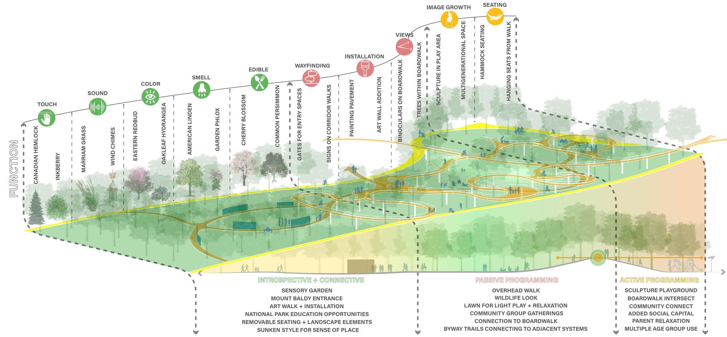 The site specifically broke up into various styles of programming, making a place for multiple user groups to inhabit and interact with one another in various ways is the objective within this space. To cater to the users coming to and from the National Park is to appeal to their stay quality, they’re more than likely attempting to have a deeper connection to the site through introspective landscape interaction. To cater to the community members would be to have additional land space to have events, for parents to have spaces to watch their children and connect with other parents for deeper social capital within the space.