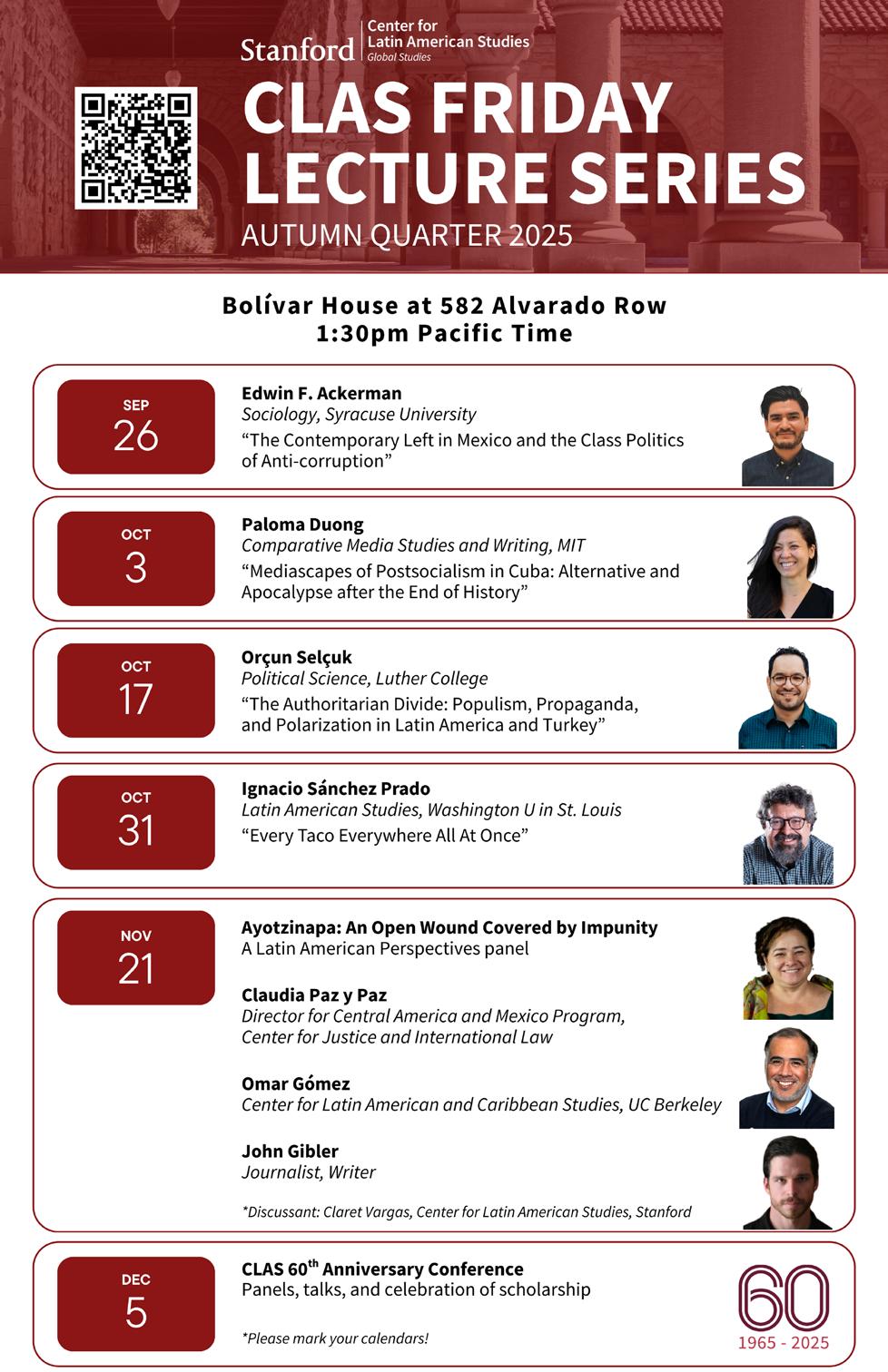 Over the past two years, through uncertain times, we had a series of milestones. Our CLAS M.A. cohort of 2025 produced stellar work, with graduates completing master’s theses and capstone papers now available through the Stanford Library’s digital repository, all eminently worth consulting. Several firsts appear in this cohort: a learned cultural studies take on dembow, the popular AfroDominican music genre; a fiduciary examination of Mexico’s latest wave of privately funded infrastructure development projects; a study of foodways education along the Sonoran Desert; an aesthetic and ethnographic appraisal of lucha libre in Mexico City and San José, California; a literary history of the trope of migrant motherhood among Chinese descendants in Perú; and a historiographic discussion of post-slavery Brazil. This ruefully
