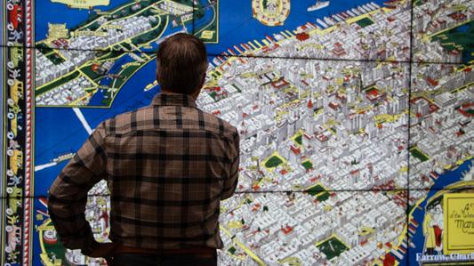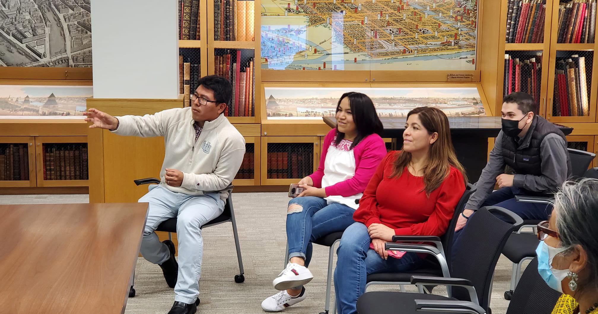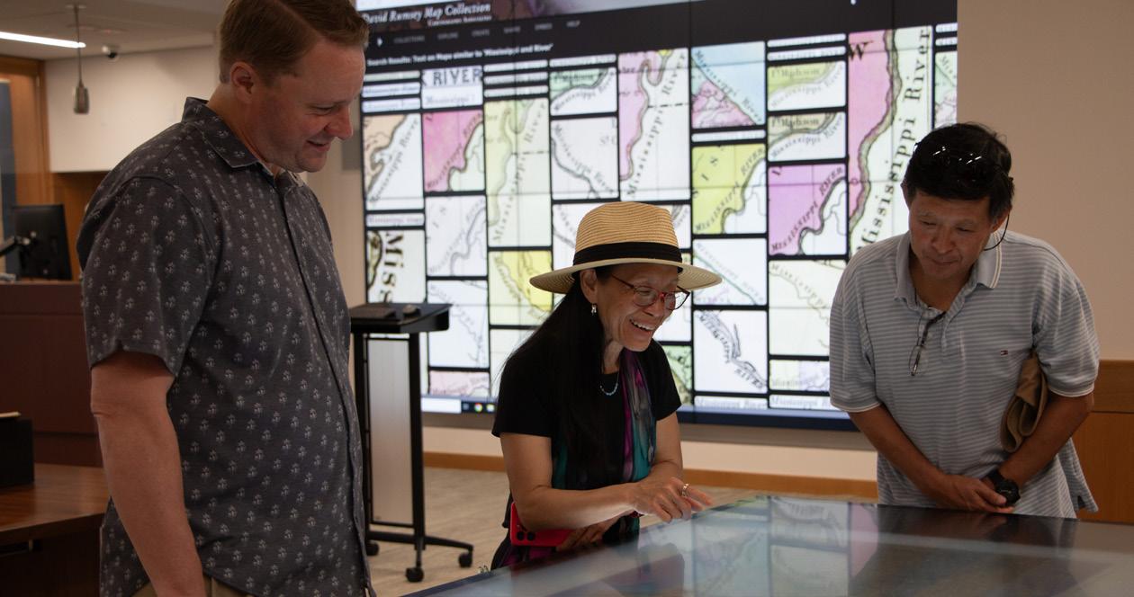 Stanford EPIC fellows look at historical maps while taking a tour of the David Rumsey Map Center.