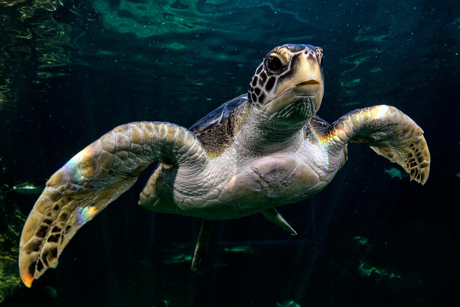 Green turtles are so named because the fat layer underneath the carapace (shell) is green. The external colour of these turtles’ ranges from a very dark brown to a light brown mottled colour.